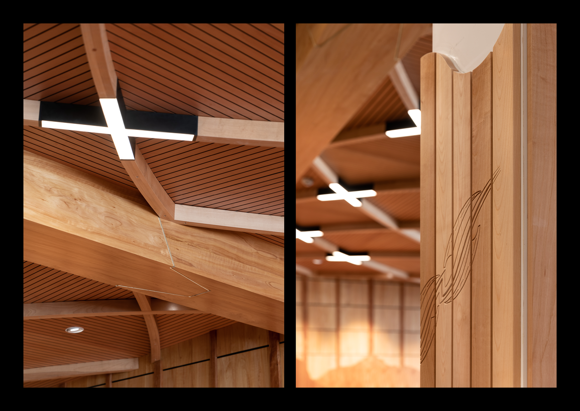 Radiating from this spine was a series of intersecting beams that bordered an intricate pattern made of wooden battens, again influenced by traditional building practices. While the ceiling design was inspired by the way whare have been built for centuries, the design remains true to its commitment to dynamic adaptation.
