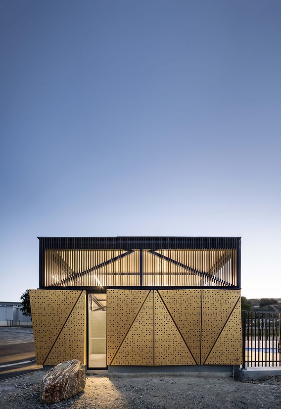 The simple yet functional design incorporates an oversized floating Zincalume roof profile that folds and concertinas over the building structure, mirroring the surrounding undulating landscape. The upper walls are screened with powder-coated flat bars designed both for ease of ventilation and extra security while allowing filtered natural light in.