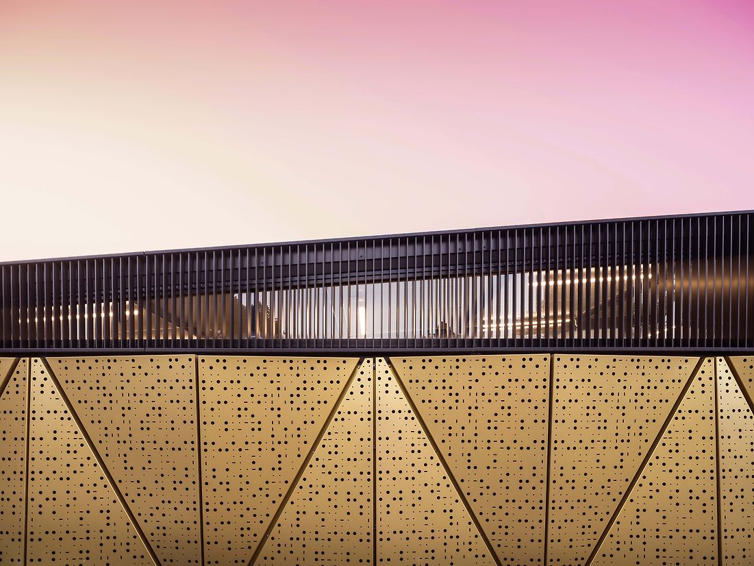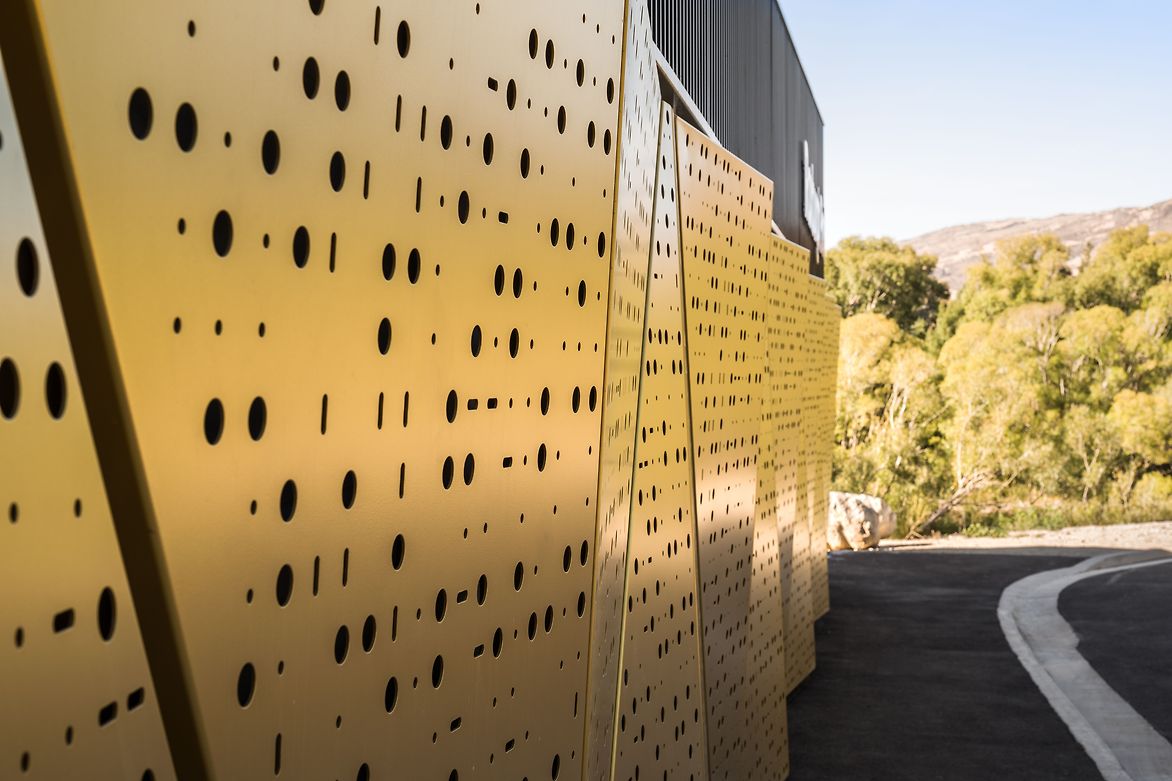 As the project evolved, the initial container-based design transitioned to a more durable and long-term construction method. The decision to use concrete block for the building structure was due to its cost-effectiveness and durability ensuring minimal upkeep over its lifetime. The block walls have been shrouded with custom perforated aluminium panels powder-coated to reflect the natural ochre/ golden hues synonymous with the Central Otago landscape. They are gently angled to reflect the natural forms of the surrounding landscape.