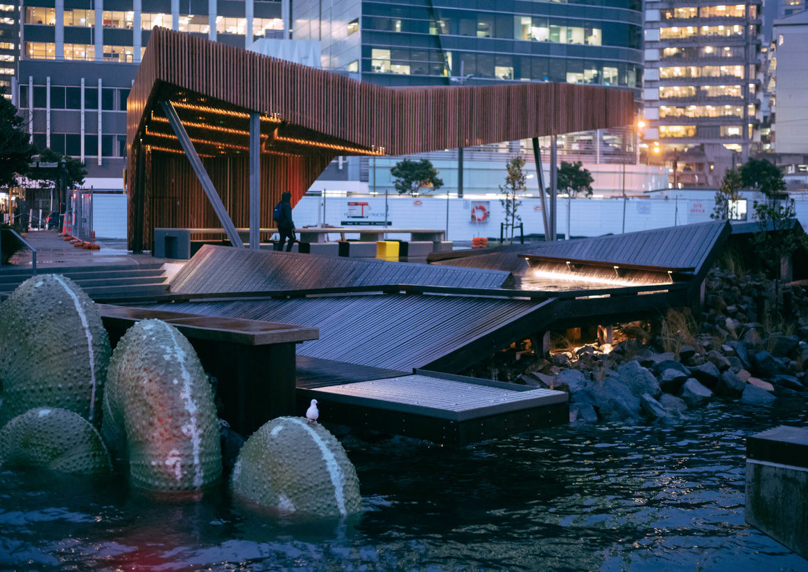 A beautiful level of craftsmanship and detail with an underlying Pacific feel. The form and scale of the building wraps and envelopes you providing a wonderful communal aspect with the large tables at the threshold of the land and sea. Crafted urban infrastructure