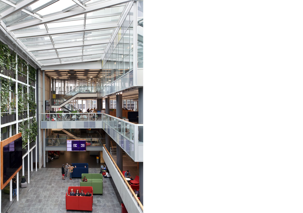 One part is the atrium, vast, column-free; an extensively glazed home to significant lecture theatres and key social spaces. The atrium is arranged around a concrete core draped with a ‘cloak’ of cherry beech. Across the ceiling soars a lattice-like, 600-ton ceiling form. Recesses in the cloak provide cave-like spaces, demarcating areas without the use of walls and challenging the scale of the building with more intimate moments. Inside the atrium’s large lecture theatre are perforated timber panels under a blacked-out ceiling.