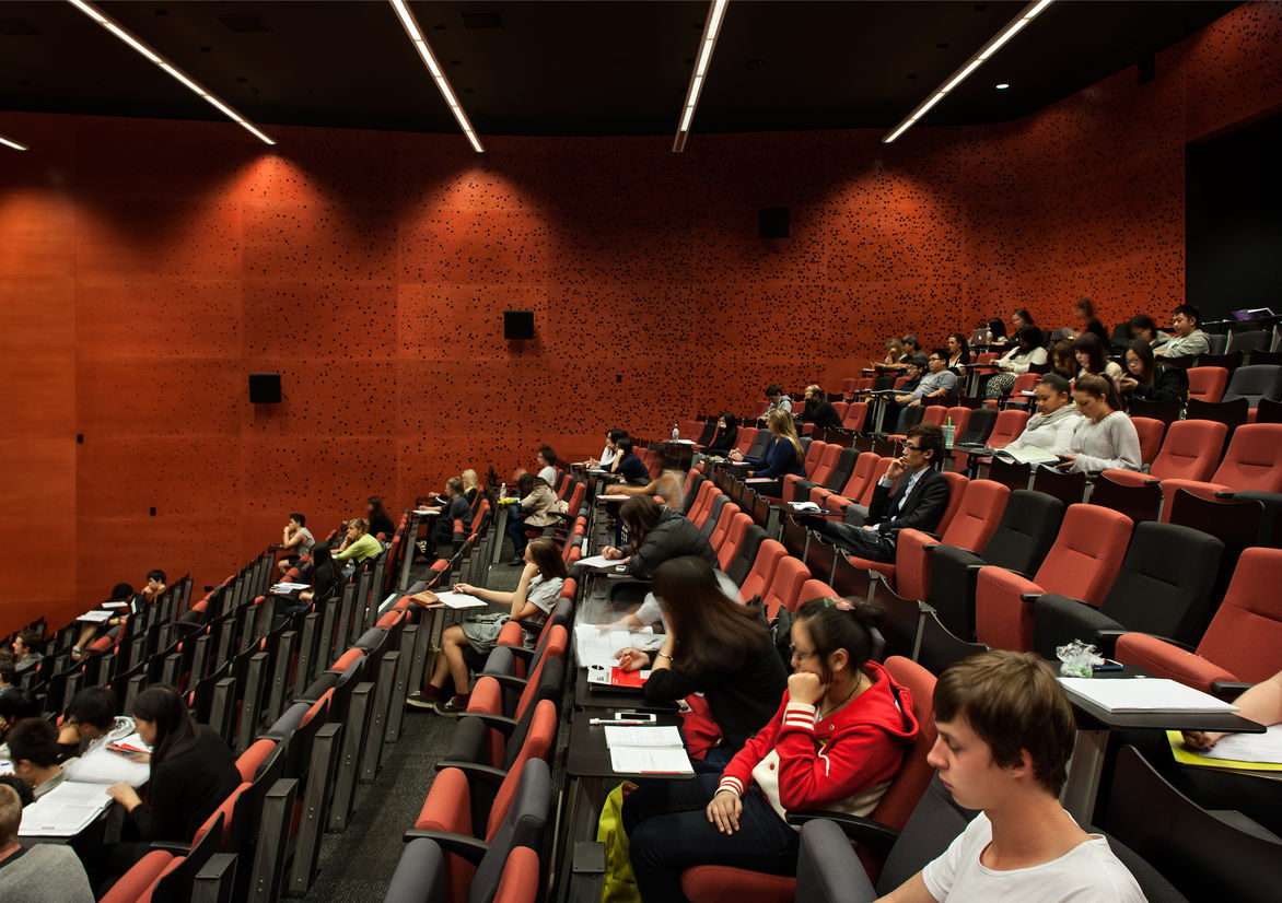 Chris Scott, who led Jasmax’s design team, remarks that he really wanted to put the theatre back in ‘lecture theatre’. He has succeeded. It is an impressive space, richly textured, and all three lecture theatres present a student-centric learning approach. The level 1 theatre, for instance, has double-width tiers and swiveling seats that allow for both lecture modes and group-focused discussion modes. The level 4 theatre’s horseshoe configuration allows students to face each other for discussion and debate.
