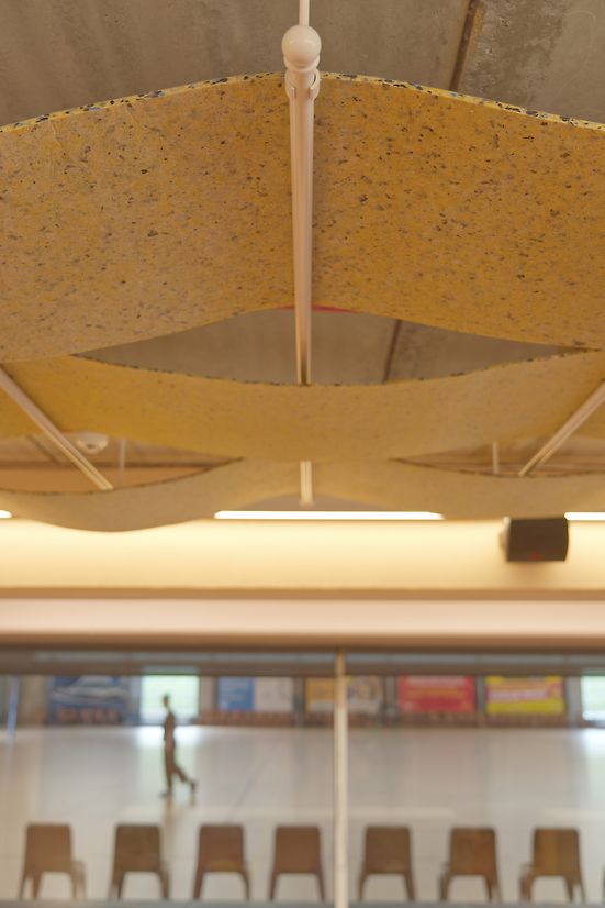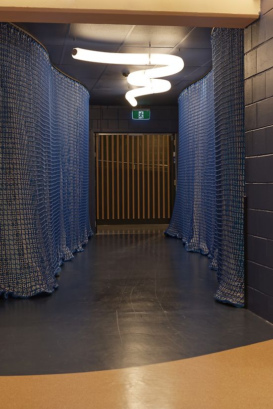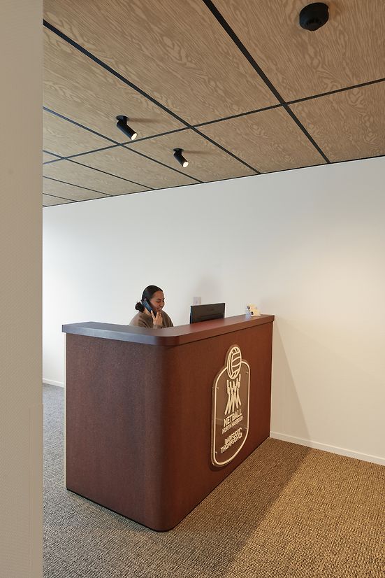 The Burgess Room, named after a legacy player, was reimagined as a vibrant, youth-friendly hub. Designed for flexibility, it supports everything from netball camps and birthday parties to café service during games. Ceiling tiles were removed to gain height, and a cost-effective acoustic solution was developed using curtain rails woven with acoustic strips—softening sound while referencing netball’s material language.