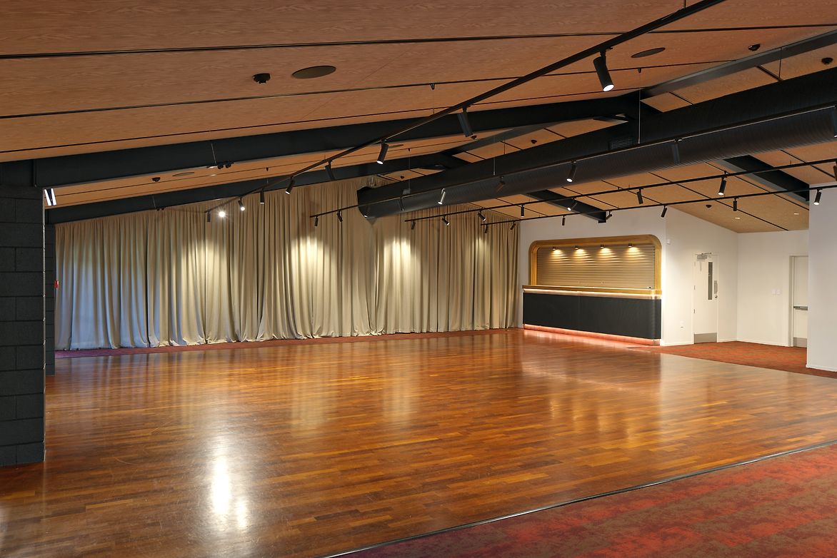 Function rooms were upgraded for commercial versatility, with raked curtains to soften the ceiling and conceal storage, red carpet tiles for richness, and new lighting for mood control. Curved, perforated metal bar panels subtly echo court markings and mesh.