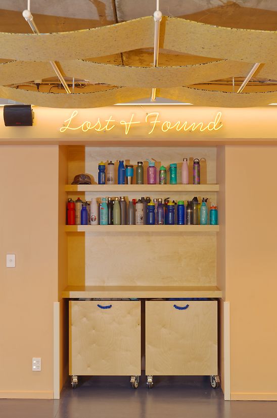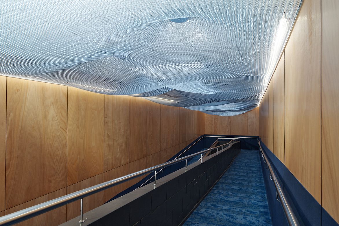 The entry foyer was completely rebalanced. An oversized ramp that once dominated the space is now a celebrated feature—framed by custom screens and a new Kaynemaile mesh ceiling with oversized buttons. Natural light pours in through existing skylights, enhancing openness and warmth.