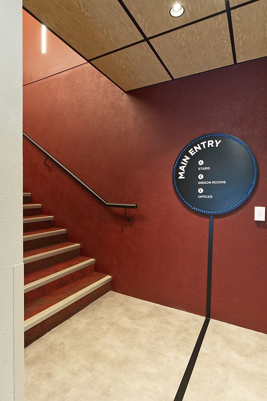Spatial sequencing plays a central role. Immersive, darker transitions—such as a deep blue tunnel to the Burgess Room and a rich red stairwell to reception—create contrast and anticipation before opening into brighter, more generous communal spaces. These contrasts support orientation and add a sense of theatre to everyday movement.