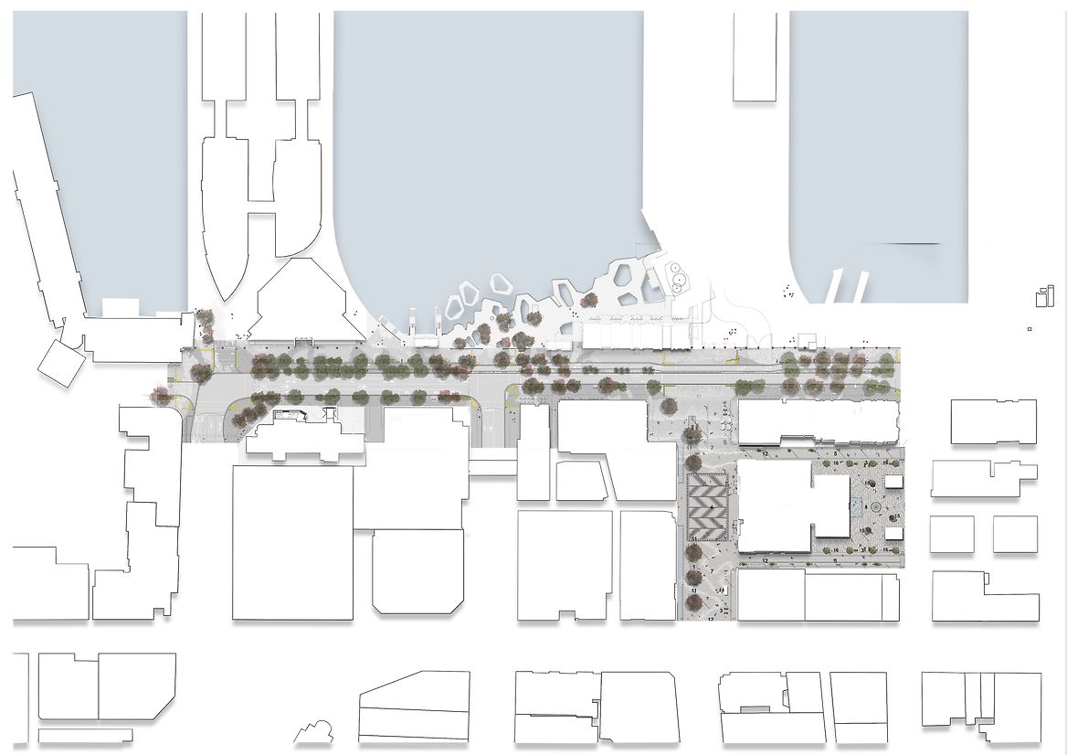 This project represents a complex public realm transformation of an historic downtown waterfront street, which included the transformation of three city blocks from a traffic congested 6x lane through-route – a severing of the city to its waterfront, to a ‘place’ for people and the environment whilst optimising walking & cycling, traffic, servicing and public transport.