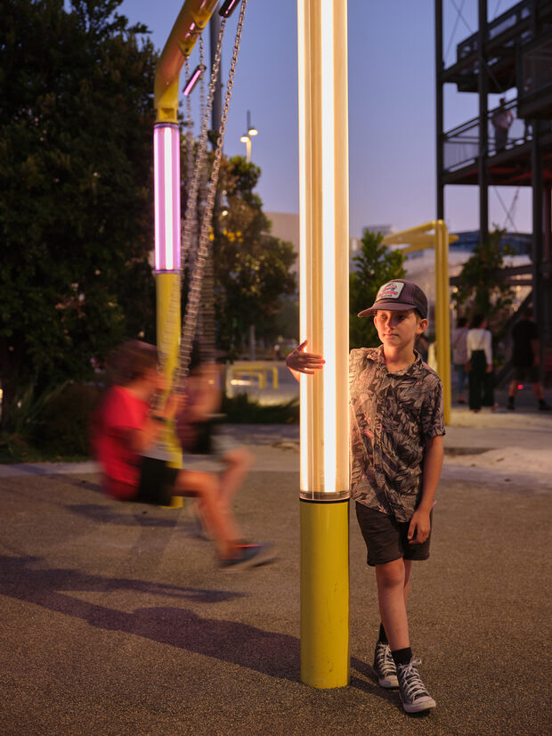 The Pipeline recalls the overhead transmission of liquids and mediates the open northerly edge against future development. It hosts an array of flexible lighting, which supports activation of the site at dawn, dusk and into the night.
