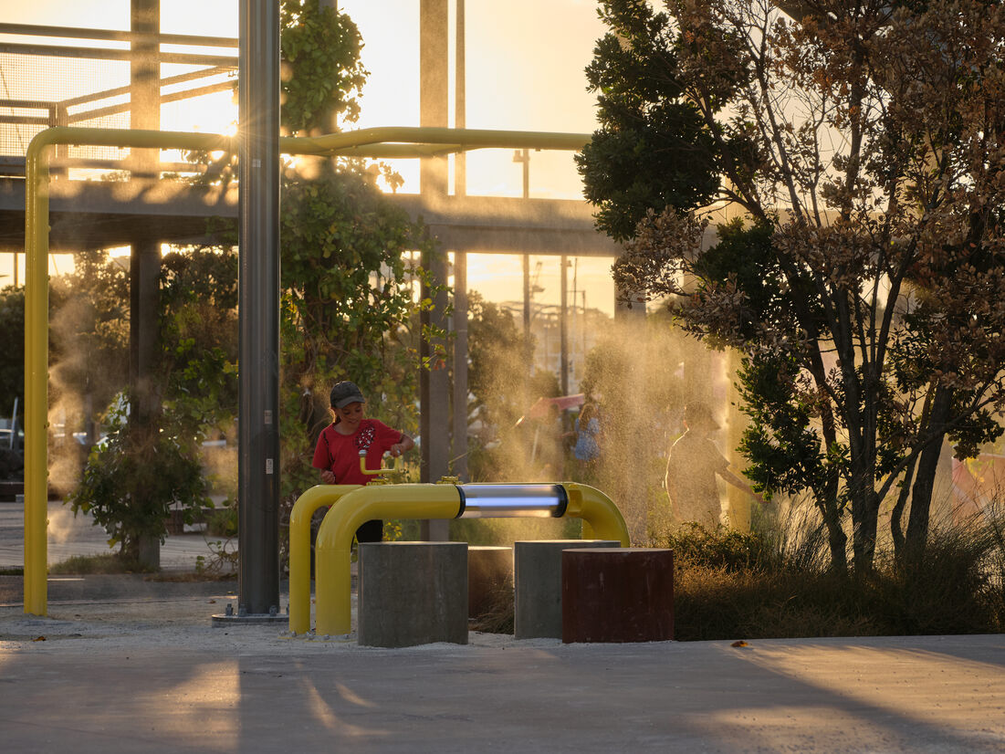 The Playline is a suite of all-ages, industrial play elements crafted and re-purposed from the site's former network of pipes, taps and valves. These are distributed along the southern edge - emerging from the ground as a playful recollection of the complex functions which once took place here - incorporating the tactile additions of light, sound, water and play.