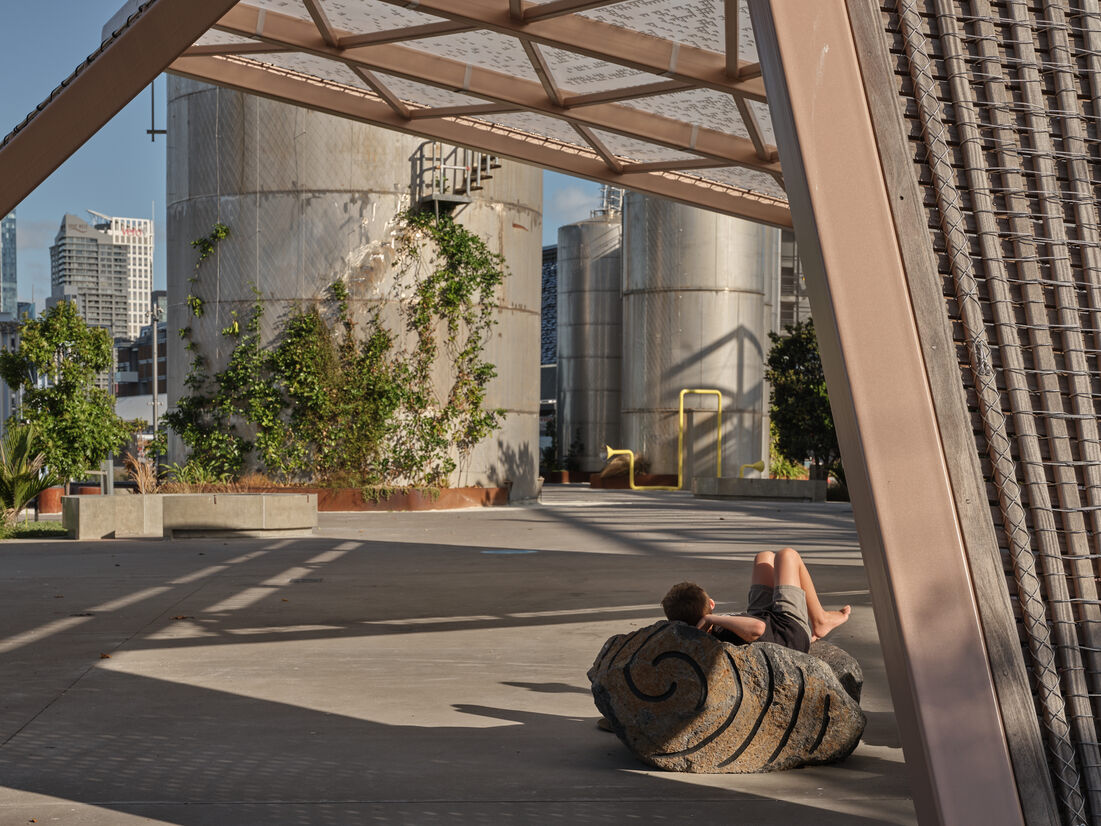 Te Nukuao (The Shelter) represents the deep connections that Tangata whenua hold as kaitiaki (guardians) of the whenua (land) and waters (Moana)—designed in collaboration with mana whenua artist Tessa Harris (Ngāi Tai ki Tāmaki) as a ‘cultural marker’ within the site.