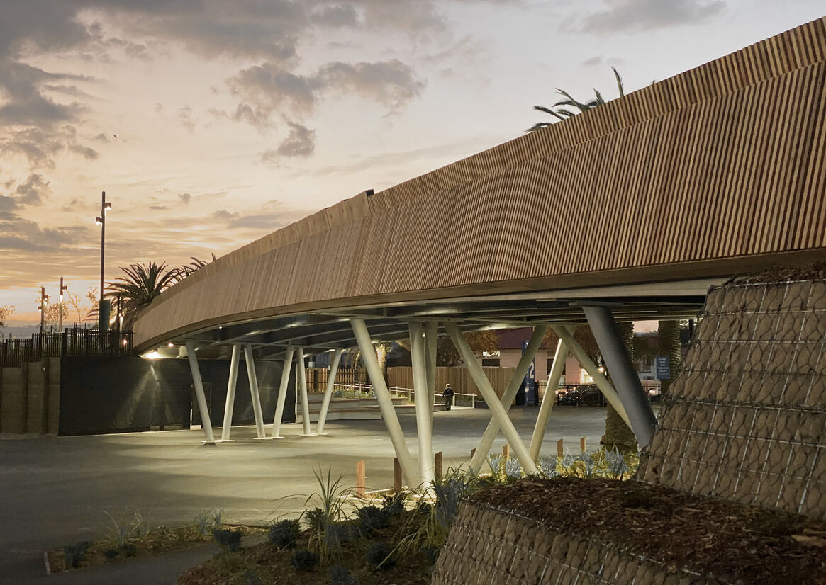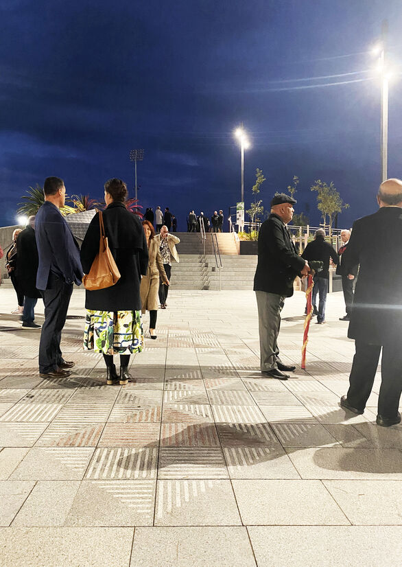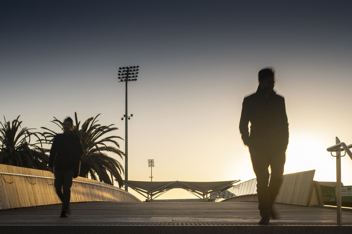 The entrance is open and inviting, low edges define the space. He kāhu elevated 600mm above the street is grounded with stone and niho pathways that ‘zig zag’ visitors through a grove of kowhai, elevating them to bridge level. Strong tāniko borders add texture and depth and are decorative details woven within the cloak’s structure, visible on seating, walls and paving. The footbridge, laced with timber, is a thread raising visitors from he kāhu into the main arena creating both a sense of expectation and a moment of peace and pause before the action. Illuminated and activated by digital displays, the bridge lifts visitors above the speedway activity with a subtle arc to reveal the main arena.