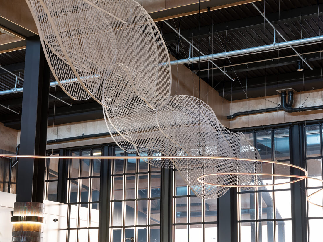 An enchanting assortment of ethereal cloudlike forms are suspended in the main ceiling void. The wispy cirrus cloudscape is lightweight and transparent, they allow natural light to pass through creating a warm glowing ambience during the day. At night coloured lighting heightens the mood and provides the opportunity to project imagery onto the forms for shadow play and theatre.