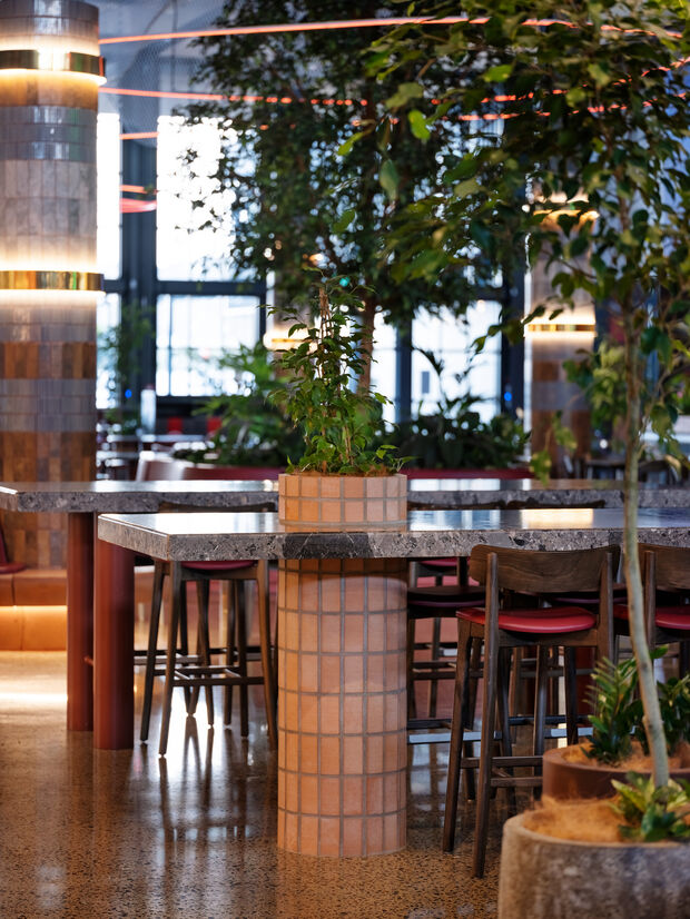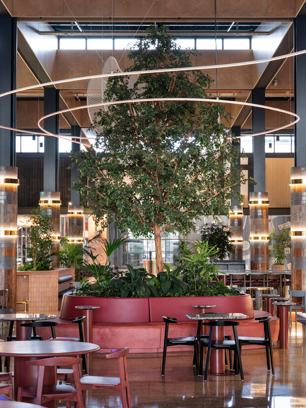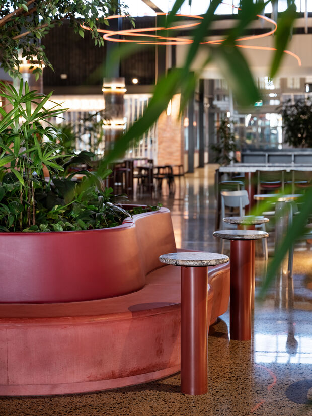 Lush greenscaping softens the masculine building envelope. A hero tree lies at the epicentre, its canopy reaching to the cloudscape above. NZ native planting abounds in the bespoke organic concrete formed banquette seating and planters.