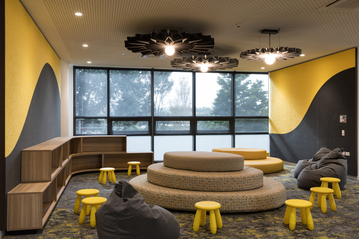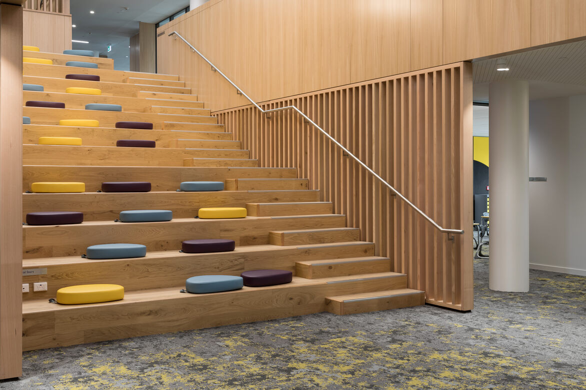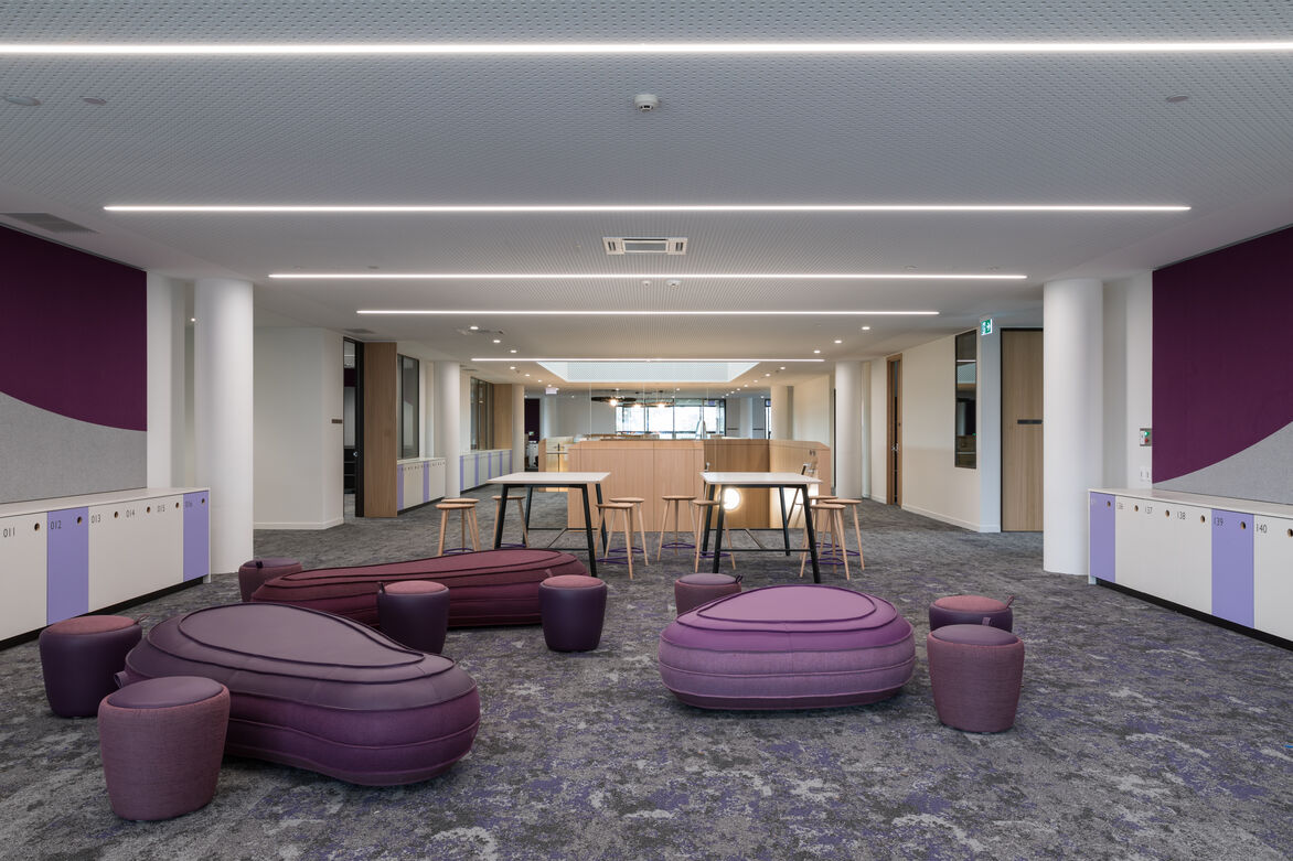 The scope of the interior design and delivery included: interiors finishes for all hard and soft fitout elements, furniture and fittings, feature lighting and graphics. The building required a considered design approach to create an optimal learning and teaching environment that achieves connection, engagement and functionality.