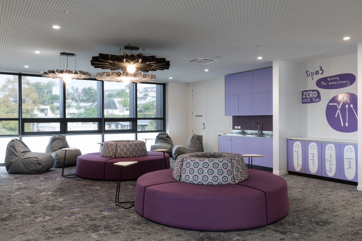 Integrating the house colours in the finishes palette grounded the space in the school's traditions while connecting with the specific learning needs of young women at different maturity levels. For the young students in their formative years, yellow is used on their floor to provide a creative and inviting space. As the girls grow and mature, teal was selected on level three, which created a sophisticated and tranquil space. The top floor incorporates purple tones, creating a sense of maturity and wisdom as the girls complete their primary schooling. Integrating softer elements and curves in the interior creates vibrant feminine energy throughout the building. The spaces are perfectly balanced with a level of sophistication while having a sense of playfulness.