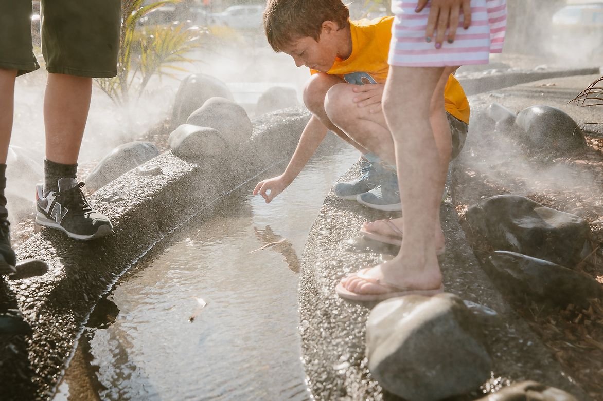 Visitors follow water from an elevated starting point (the ‘misty mountains’) along gently sloping ‘rivers’, see it seeping into the aquifer and finally paddle in gentle ‘ocean’ waves.