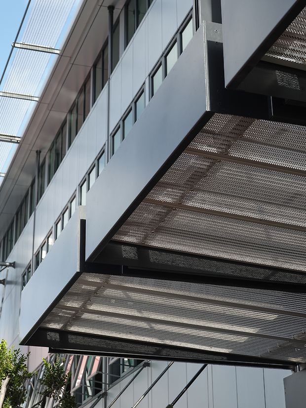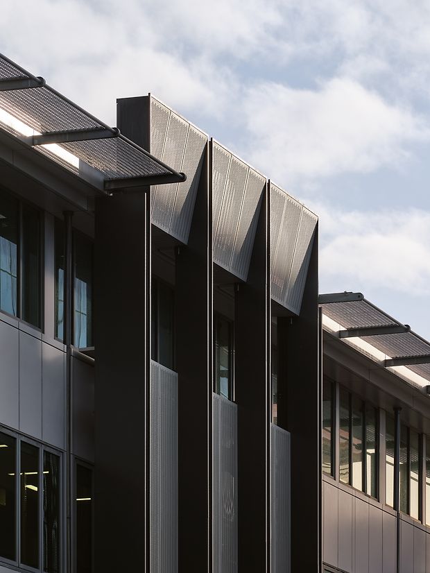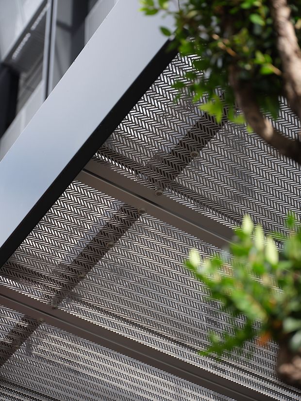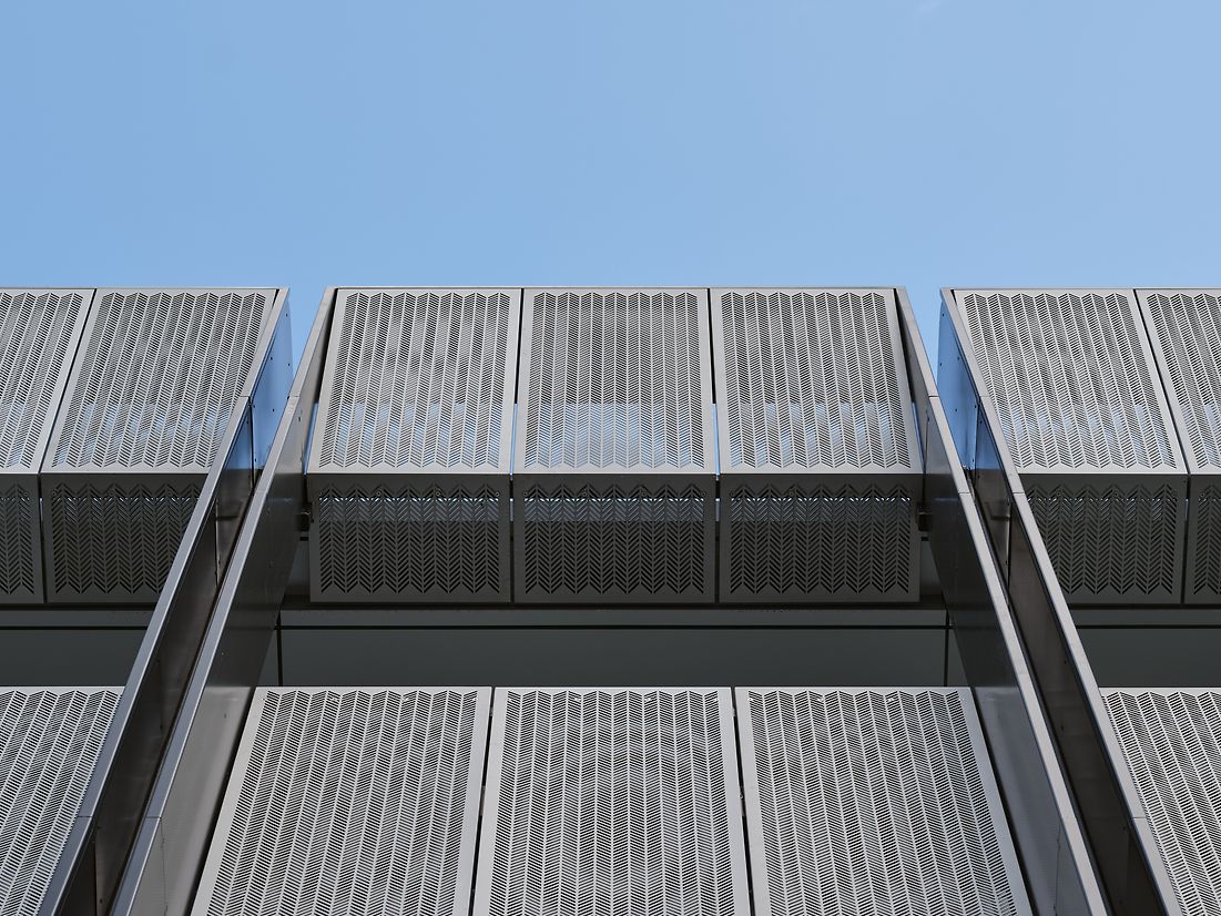 The solution was a prefabricated façade system made up of three-storey panels, designed to be craned into place and fixed directly to existing structural cleats. Vertical steel uprights, wrapped in folded aluminium, give the façade rhythm and weight, while perforated mesh panels in a herringbone pattern add texture and continuity. These elements extend down to form a canopy at street level and fold back at the upper level to preserve views from inside.