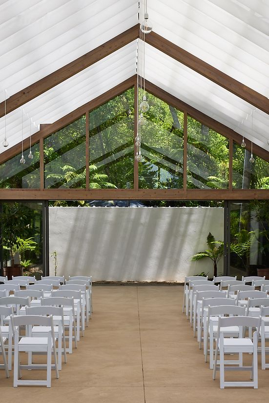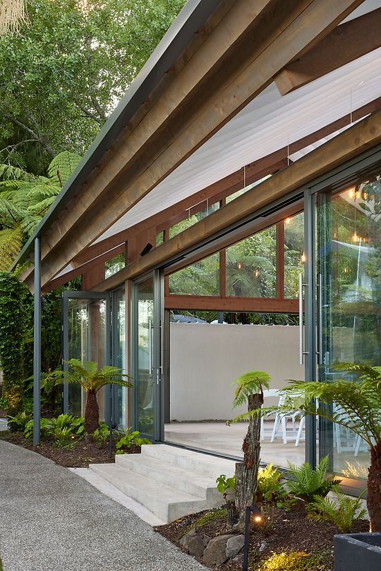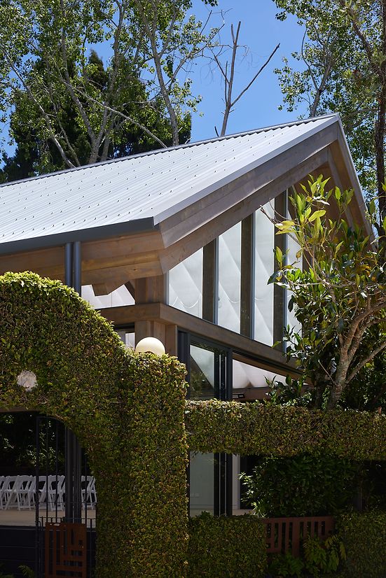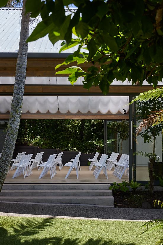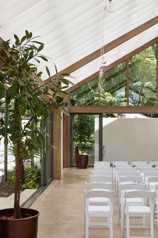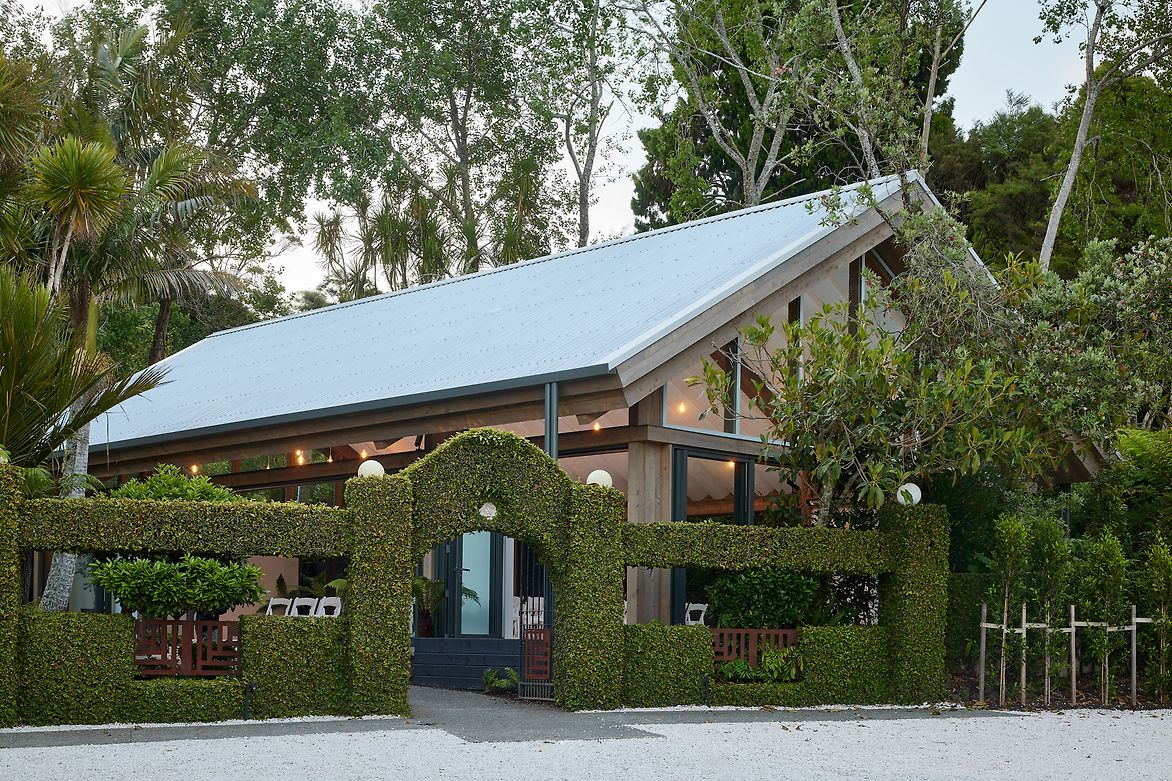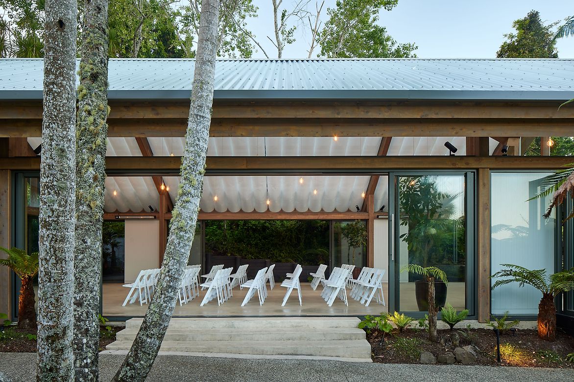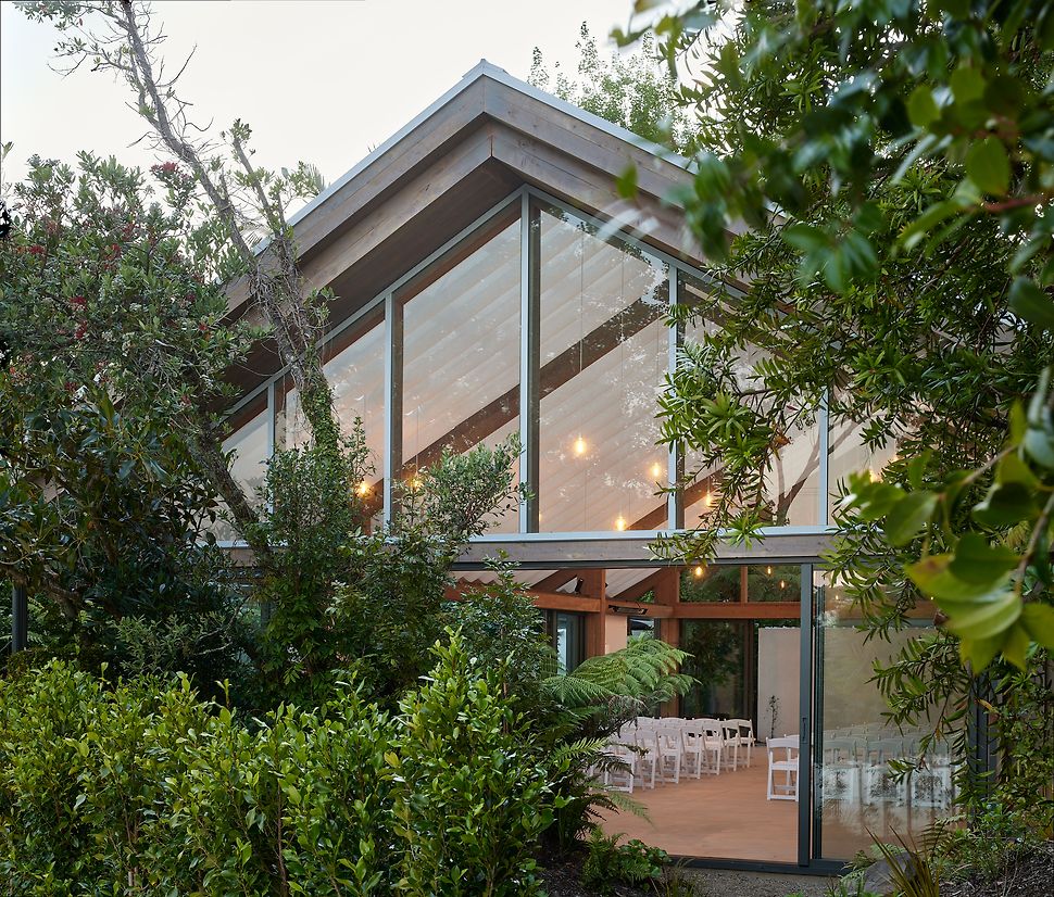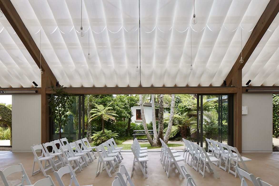 A landscape pavilion within an existing events venue in the Waitakere Ranges. The pavilion provides a flexible space for hosting events and weddings, nestled amongst native forest. The translucent roof and draped fabric ceiling are suspended over mass timber portal frames, and allow filtered natural light into the pavilion that shifts with the movement of trees and clouds above. Glazed walls can be pulled back to connect to the surrounding gardens and bush, with deep roof overhangs that protect the occupants year-round.
