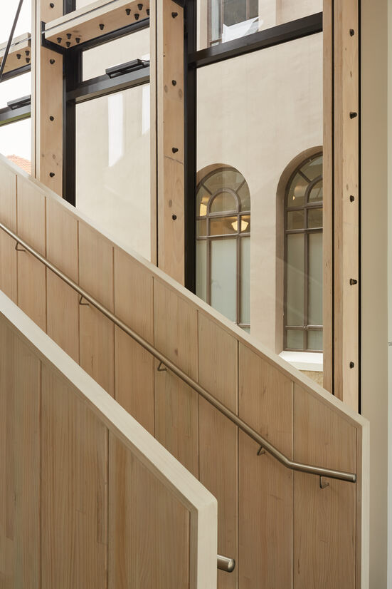The new entry building is designed as a light pavilion, with timber LVL structure and a timber/glass exterior. This is a response to the heavy mass, hierarchical original building and referenced the treed backdrop beyond the buildings. Timber was used extensively in the stairs, balustrade, cladding and interior trims. The use of timber achieved a better carbon footprint while also providing a finished aesthetic.