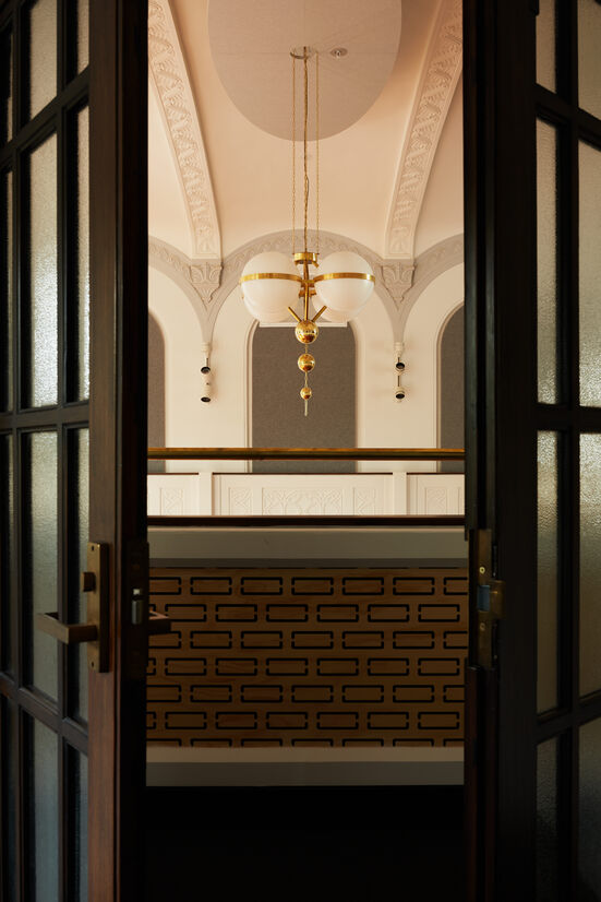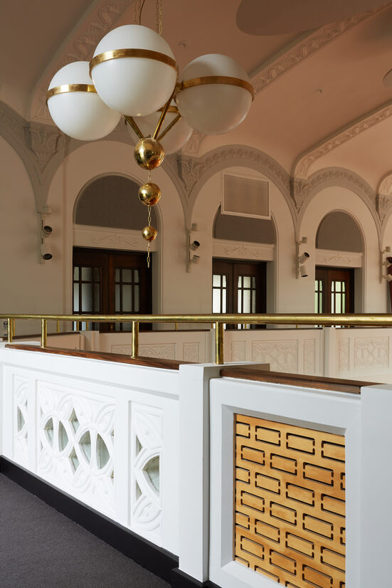 Innovation and creativity were important to the project as these principles were used in the careful reconstruction of heritage elements and in the design and construction of the new building. Sustainability was a focus and the approach was to, where possible, retain and repair original building materials. All steel windows and roof tiles where refurbished and re-used and where materials needed replacement, recycled items were sourced. Specialist trades were involved in the reconstruction, including plasterers and metal workers to replicate original plasterwork, chandeliers and light fittings.