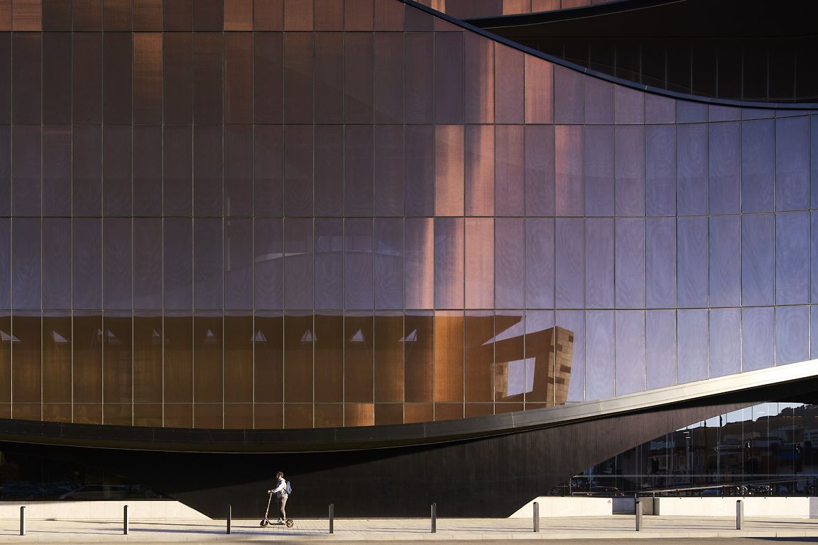 The 18,000m2 building is characterised by the layering of façade elements. Primarily clad in a ‘shimmering’ SEFAR glass skin, the exterior responds to differing light conditions throughout the day. At times a singular overall form is prominent as the glazing appears opaque and monolithic, while at other times the translucency reveals a subtle inner shape and a glimpse of the activities within.