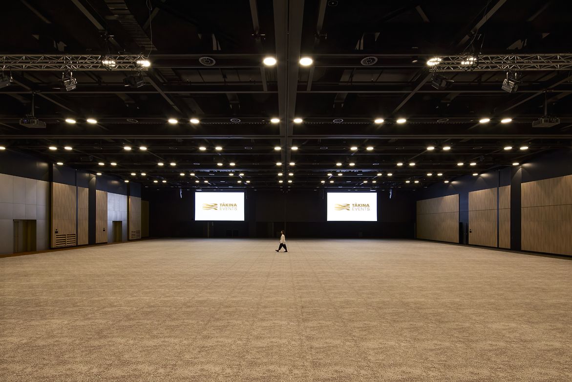 The ground floor houses the main public lobby, a large exhibition space, retail, and café spaces. The eastern edge of the site includes a dockway and service laneway between Cable and Wakefield Streets. A west-facing outdoor courtyard between neighbouring buildings provides natural light to the midpoint of the public lobby. Spanning across the top two levels of Tākina, the convention and meeting spaces have capacities that range from 200 to 1,800 people in a variety of flexible configurations.
