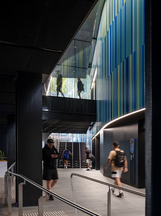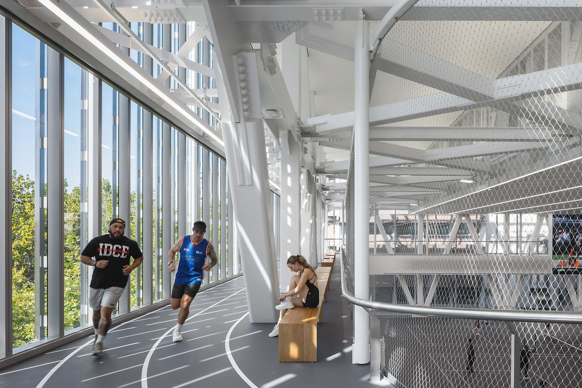 It delivers a world-class range of recreation and wellness spaces in an innovative vertical configuration: a below-ground aquatic hall, squash courts, group fitness areas, weight and cardio facilities, dance and yoga studios, a rock-climbing wall, multi-purpose sports halls, a major show court with spectator seating, and rooftop turf and relaxation spaces.