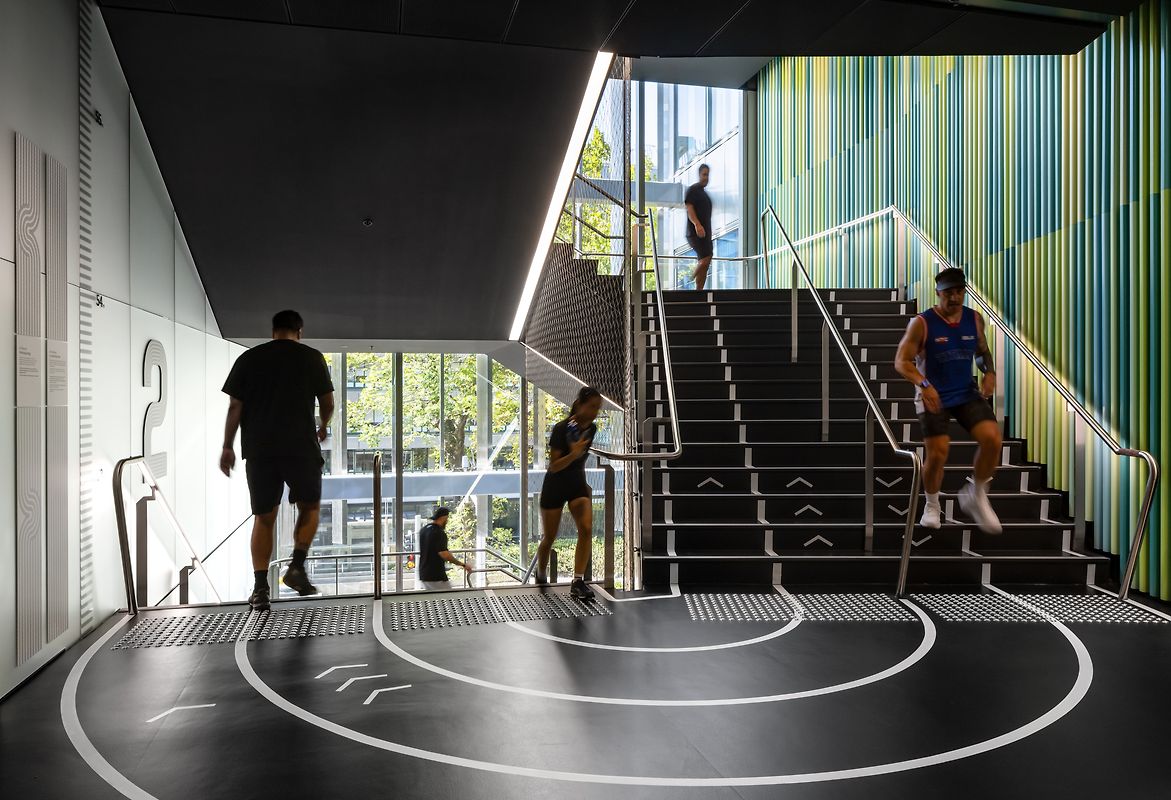 These functions are seamlessly connected by a continuous vertical fitness circuit, comprising stairs and mezzanine and rooftop running tracks, ensuring activity and movement is on display. Complementing its active programs, Hiwa also provides dedicated social and relaxation spaces to encourage community interaction.
