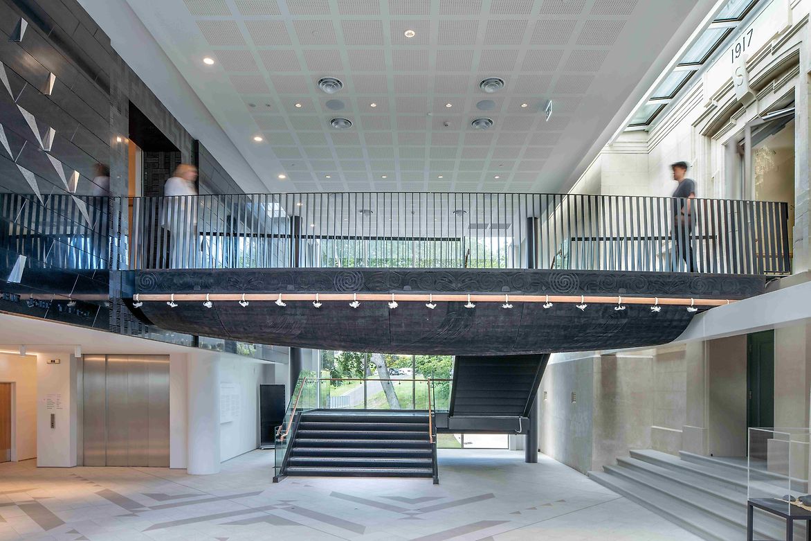 The design embraces Māori design principles and storytelling, recognising the river’s sacredness and its central role in Māori identity. The black granite façade, embedded with stainless steel tioata (crystal-like shards), reflects the river’s shimmering surface, capturing the phenomenon of kānapanapa—light dancing on dark waters. A waka (canoe)-inspired bridge symbolically links the old and new structures, bridging Māori and colonial perspectives. This bridge is not only a physical link but also a cultural and symbolic one, acknowledging the unique relationship between Māori and the land, and between past and future generations.
