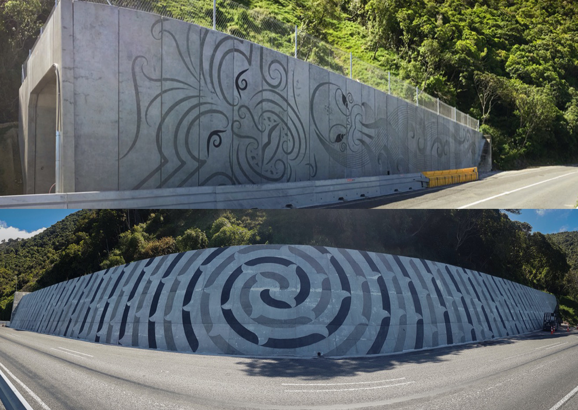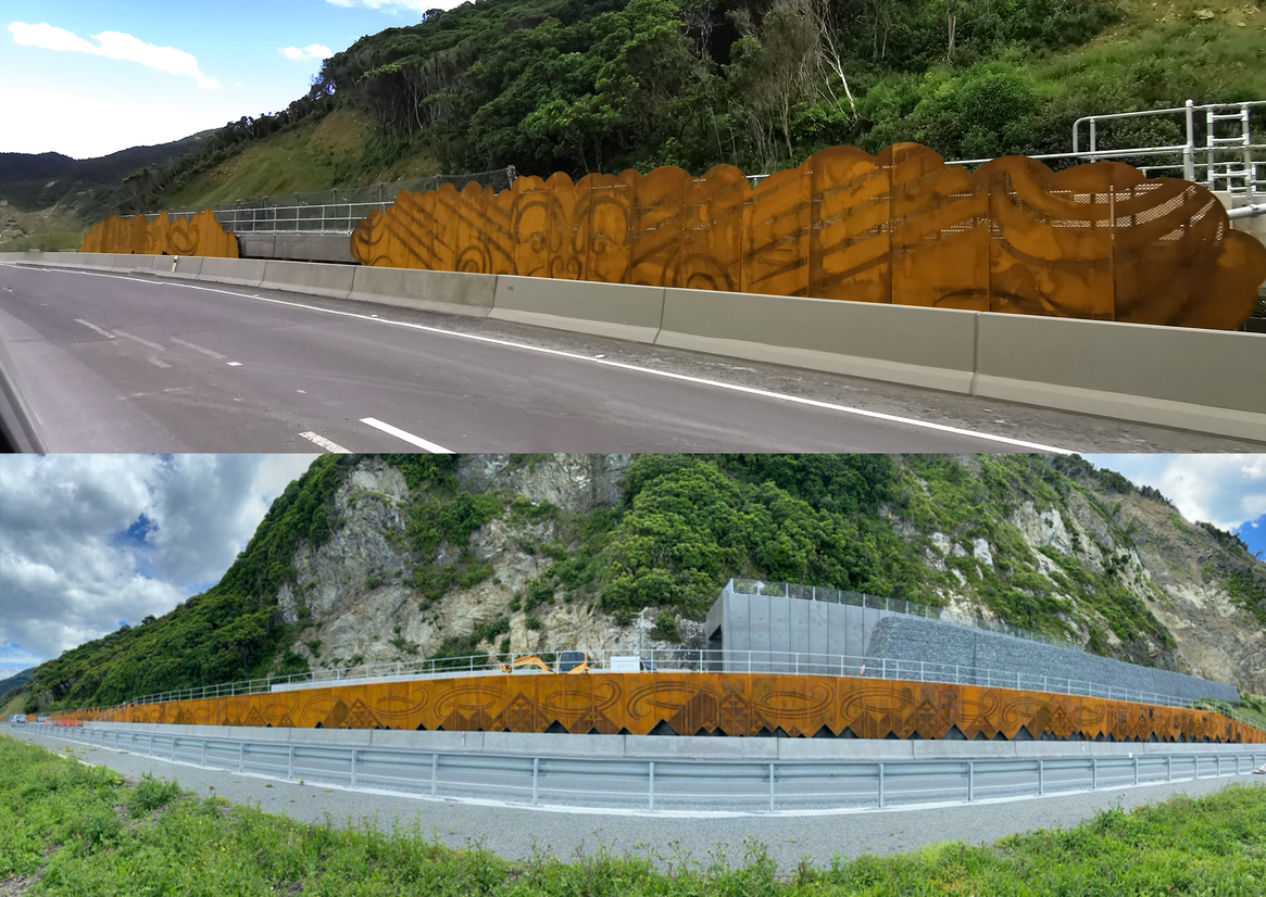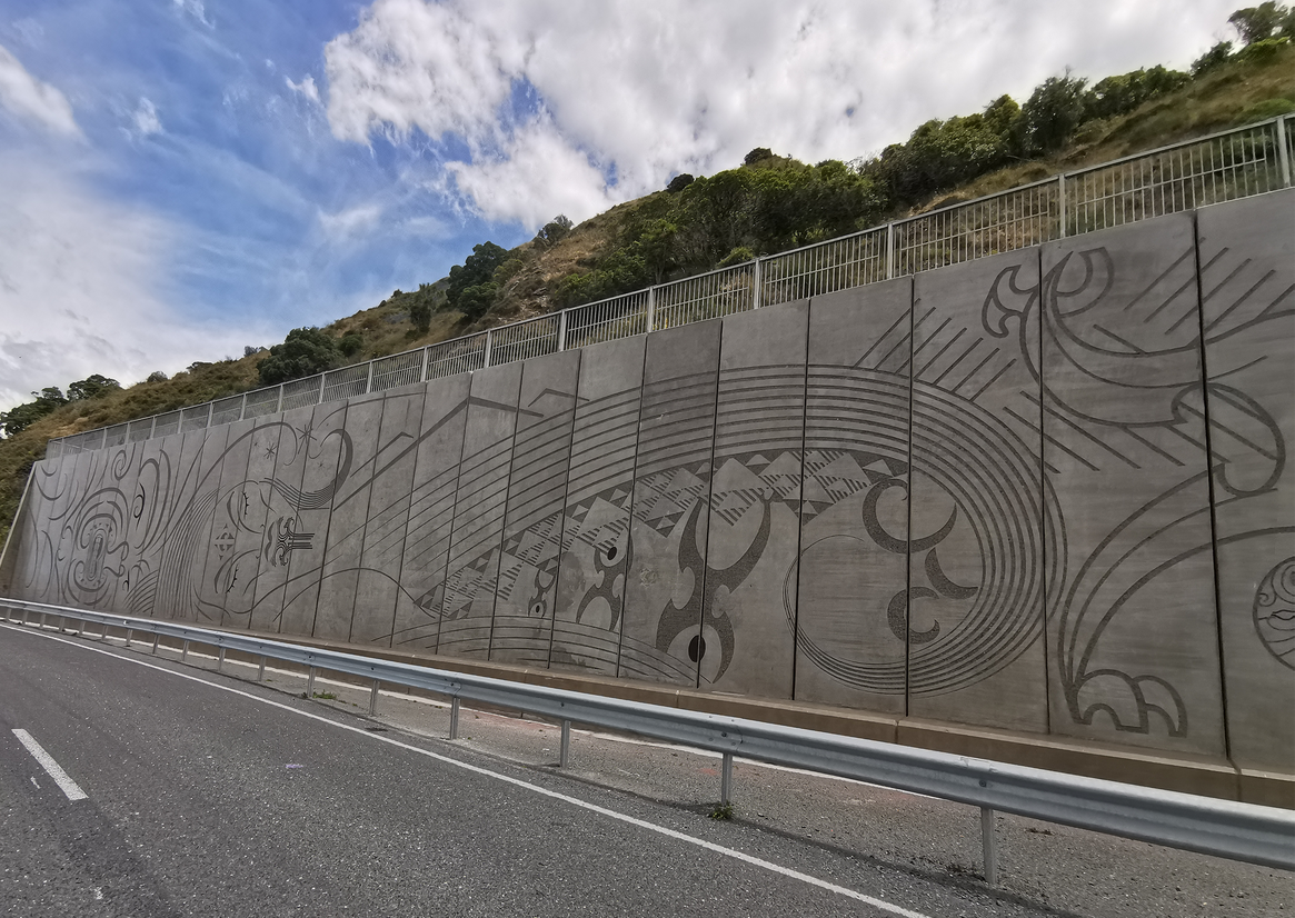 Te Runanga o Kaikoura in partnership with Waka Kotahi, Kiwi Rail and the North Canterbury Transport Infrastructure Recovery (NCTIR), led a team of creatives, artists and designers to produce artwork connecting purakau and whakapapa into the landscape of Kaikoura after the 2016 earthquakes.