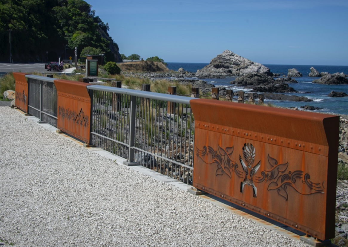 The Cultural Arts Package consists of 4 pou whenua, 10 stopping sites and 11 largescale murals sandblasted and laser cut into corten steel, created and designed by teams of artists, designers, carvers and technicians working over two and a half years.