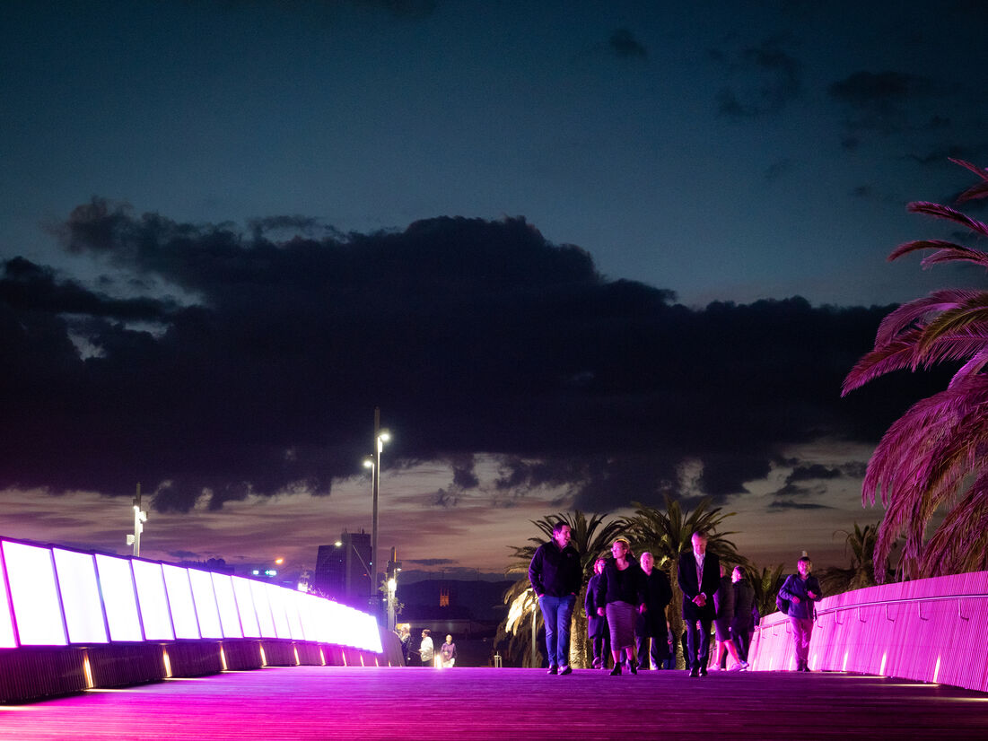 The move to introduce vertical separation created a dynamic entrance experience to the arena and yielded more event overlay opportunities for the site. Palmerston North is a "flat city" with little in the way of topography other than river valleys to create vantage points. The bridge provides both a controlled entry point and creates a moment of anticipation as patrons move up through the landscape and traverse the camber to see right into the main events arena from an elevated position.