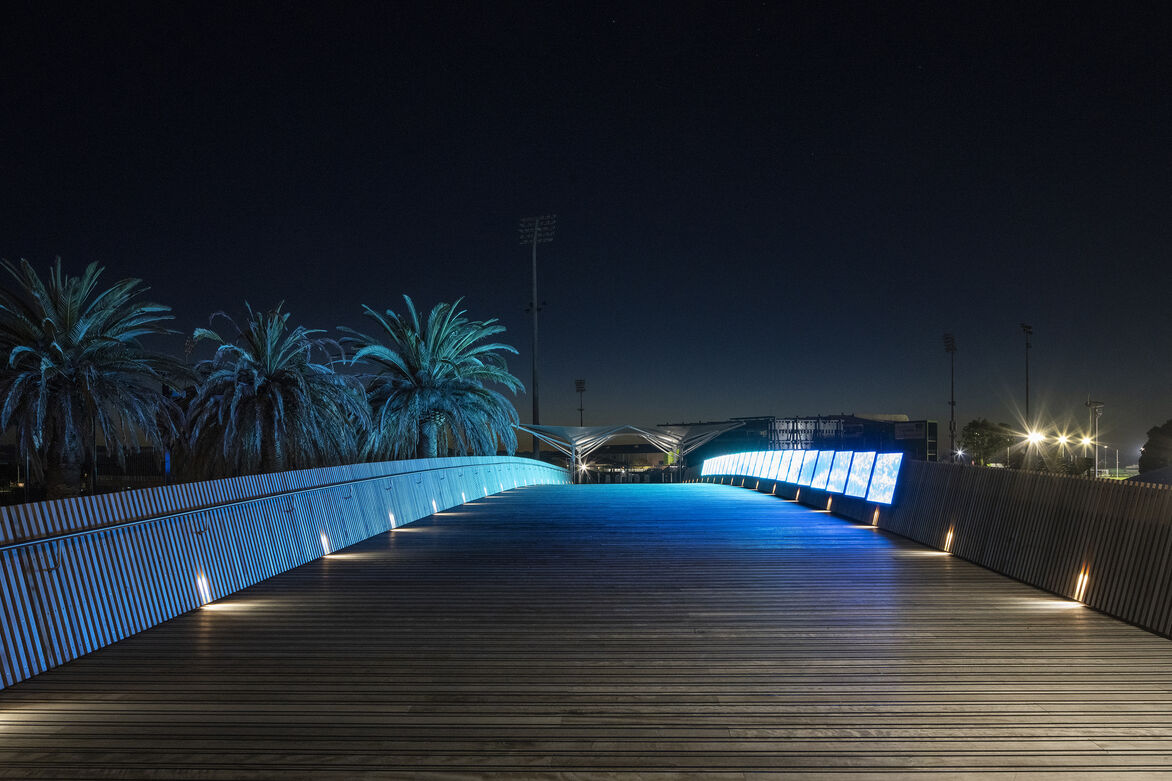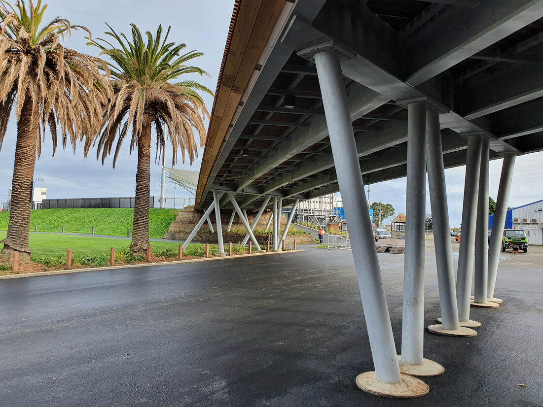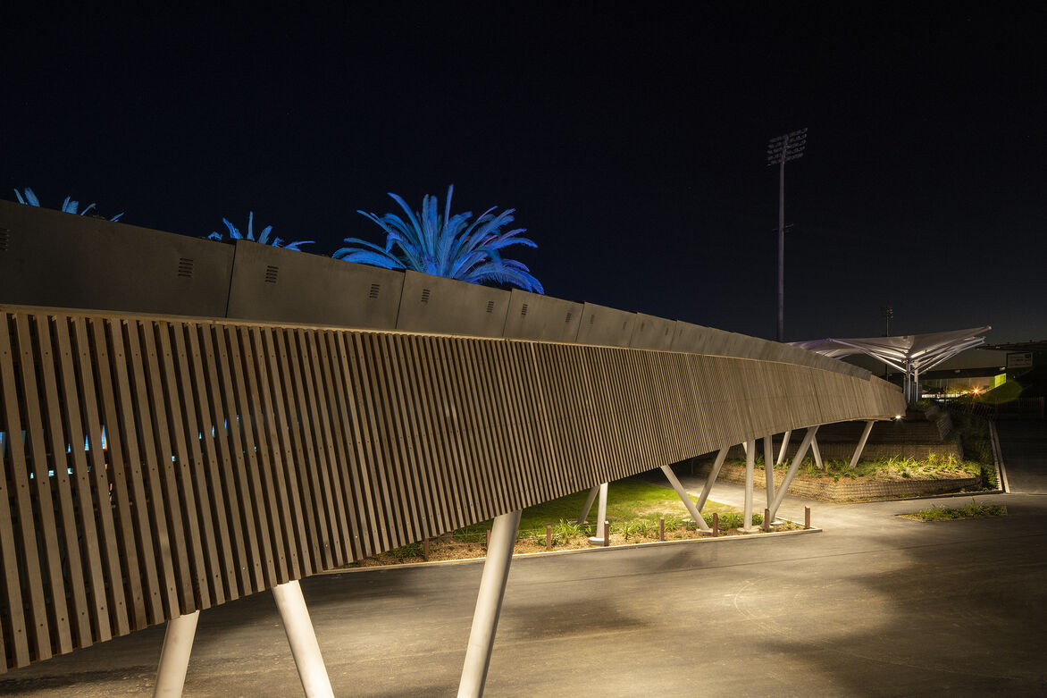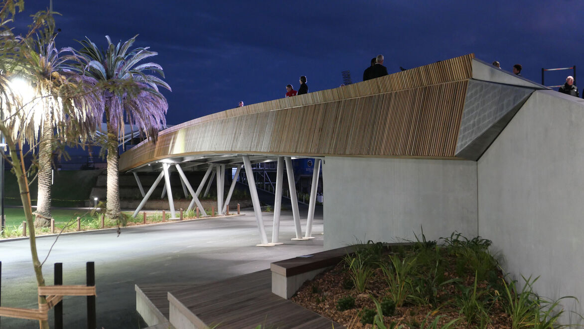 The architectural design of the 45m long bridge had a number of functional requirements driving a technically complex response. Gradients could be no more than 1:20 at any point to remain universally accessible. It had to provide a minimum 4m clearance below the bridge for fire and emergency services vehicles without altering the existing site levels. It had to provide a 25m clear span to allow the speedway racing staging area to operate unencumbered below it and it had to arrive at the existing main arena concouse level.