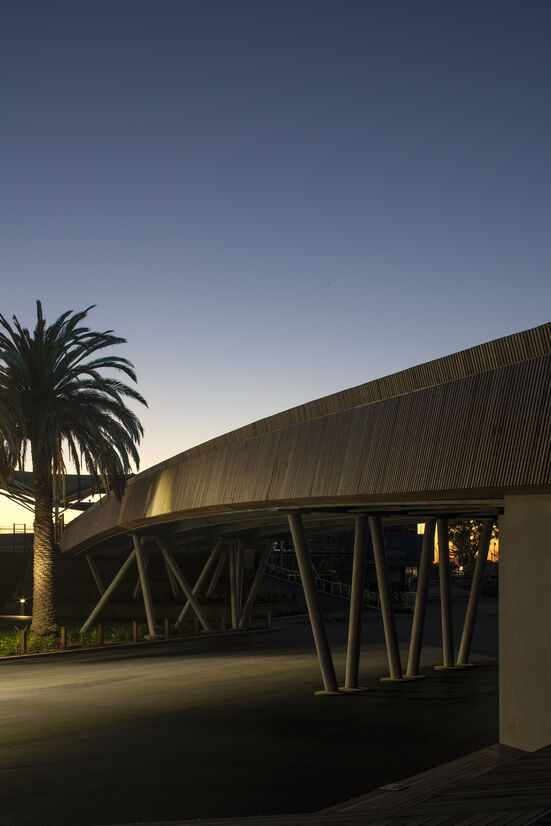 Our aproach was to design the bridge with as few pieces as possible. It was this (along with the functional requirements) that generated the shape and the askew column placemement. The columns resist the twist of the bridge at 45 degrees to the orthagonal underlying masterplan. They also brace the elevated bridge structure in three directions against siesmic movements. The specific angle of each column allows each column to be reduced in size and reduced to the minimum number of columns required to do the job.