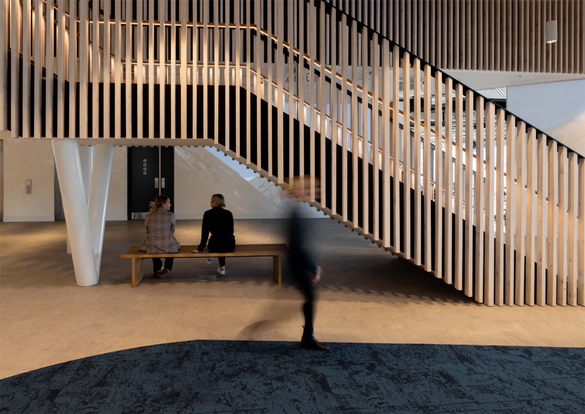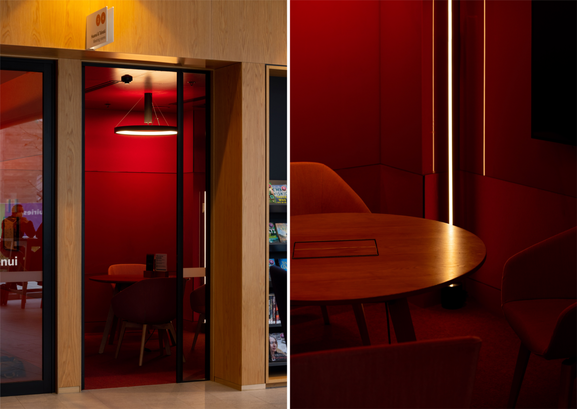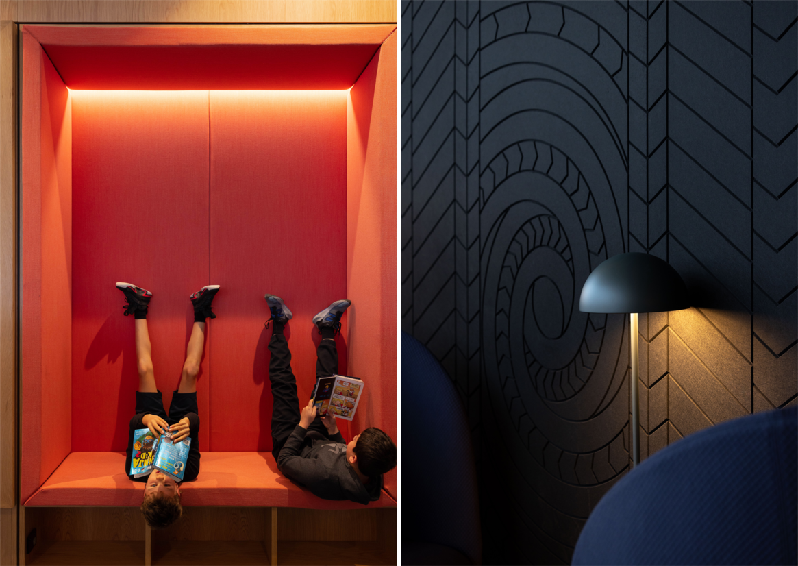 On the ground floor, the braided rivers are represented with curved forms referencing river stones eroded by the waters current. A timber clad pod houses a workshop space and meeting rooms, which are coloured in bold vibrant tones - a visual representation of the richness of the flora and fauna that inhabit the underground rivers and shallows. The Tamariki area continues the link to the water’s edge with blue feature flooring and colourful furniture.
