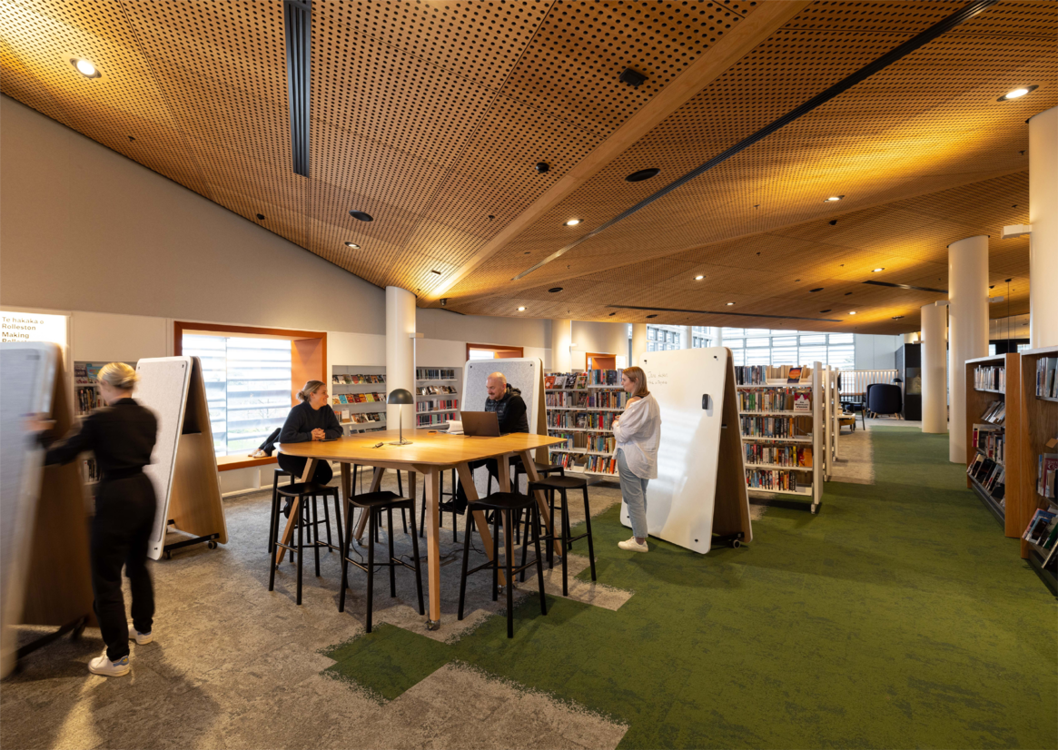 Level 1 continues the gorge narrative with the material palette referencing the weathered tops of the riverbanks, in rich and warmer tones. Grey and green feature carpet create interest and zoning throughout while a folded timber veneer ceiling following the roofline above flows continuously over the space which houses the main library collection, collaborative zone and the ‘Waka Huia’, a quiet reflective research room which connects with the cultural narrative by referencing the idea of a treasure box, and houses significant taonga from the Selwyn District.
