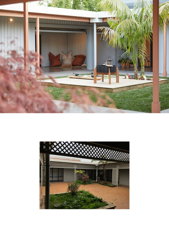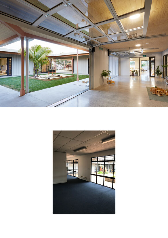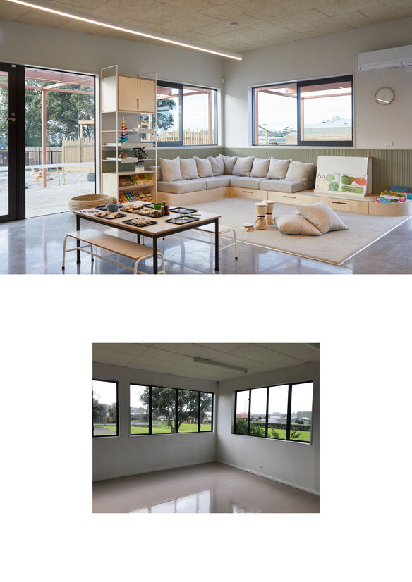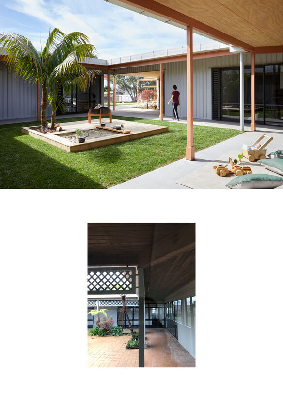 A number of interventions have been employed: A corner of the existing building was transected to connect the internal courtyard to the exterior, creating a link and viewshaft between play spaces and bringing more natural light into the courtyard. The courtyard was enlarged by pushing back outdoor walls to create sheltered generous all-weather play areas under the existing roofline. The existing window openings were kept, but many were cut through to ground level so glazed doors could be installed. Verandas were added to the north and west sides of the building to provide covered outdoor play space and also sun-screening to the windows.