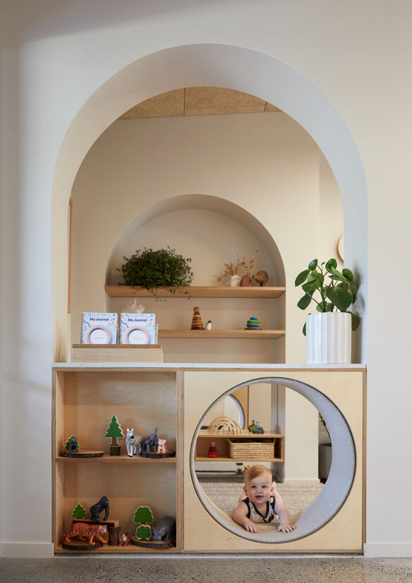 Inside the building, removal of the old suspended ceiling revealed the sloping roof structure, enabling the ceiling to be lifted and lined with acoustic panels to form high airy teaching and activity spaces. These are integrated with the children’s sleeping and bathroom areas. Administration and support zones include generous resources storage, home-kitchen, laundry, office, staff breakout and training spaces.