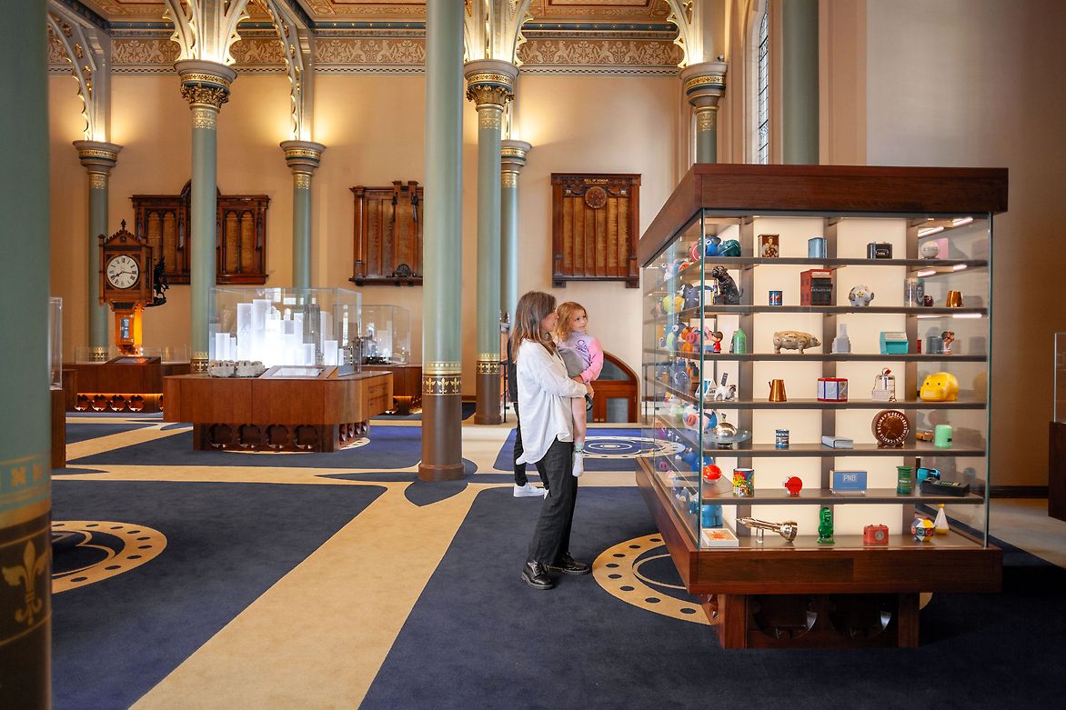 Foolscap Studio repurposed under-utilised blackwood teller counters, turning them into joinery pieces used throughout the branch and museum. Touchscreens were incorporated into these showcase cabinets to present interactive multimedia content while also displaying physical artefacts within the same unit. Motorised hydraulic lift mechanisms were also incorporated into these units to raise the 1.7m2 glass hoods and reveal artefacts displayed on top of plinths.