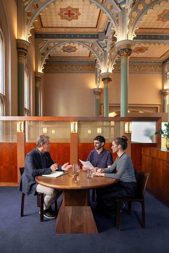 To continue the bank’s history of employing local craftspeople, Foolscap Studio collaborated with furniture-maker Hugh McCarthy and glass artist Liam Fleming to create bespoke pieces for the space. These considerate contemporary elements complement the architecture’s history while recognising the next generation of craftspeople.
