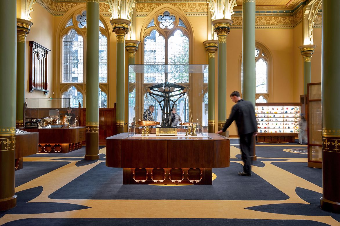 Foolscap Studio reconfigured the layout to reinstate the bank’s original footprint, allowing the uncovering and restoration of the foyer’s original mosaic tiles – 35% of which were refurbished or replicated using traditional techniques – and optimising viewers’ access to the 110m2 glass skylight. Further restoration included the reinstatement of 23 karat gold leaf stencilling on columns.