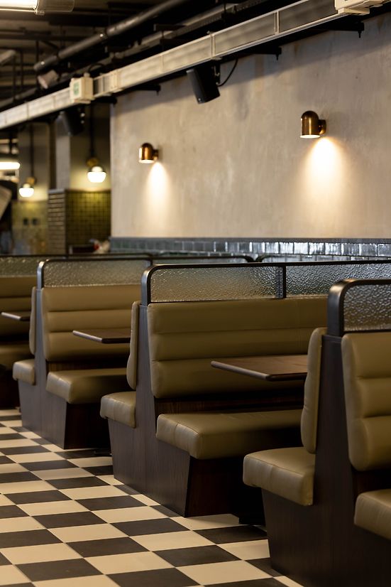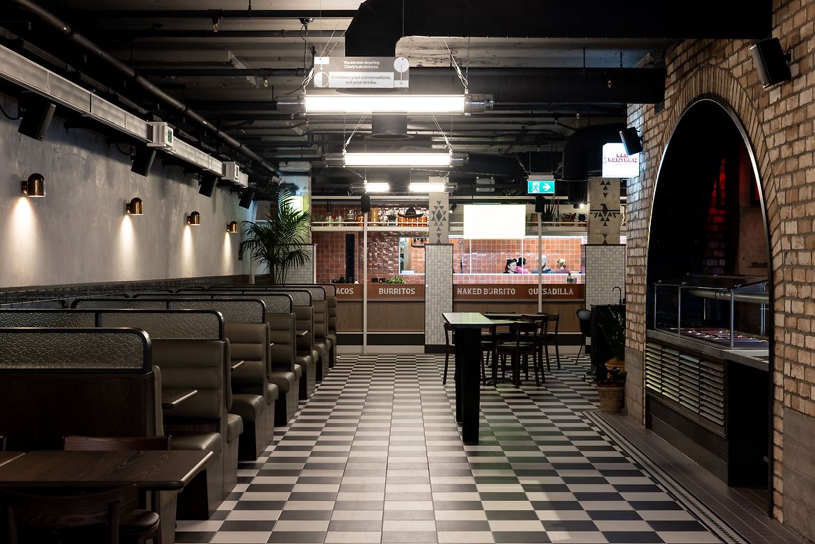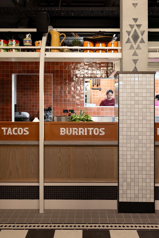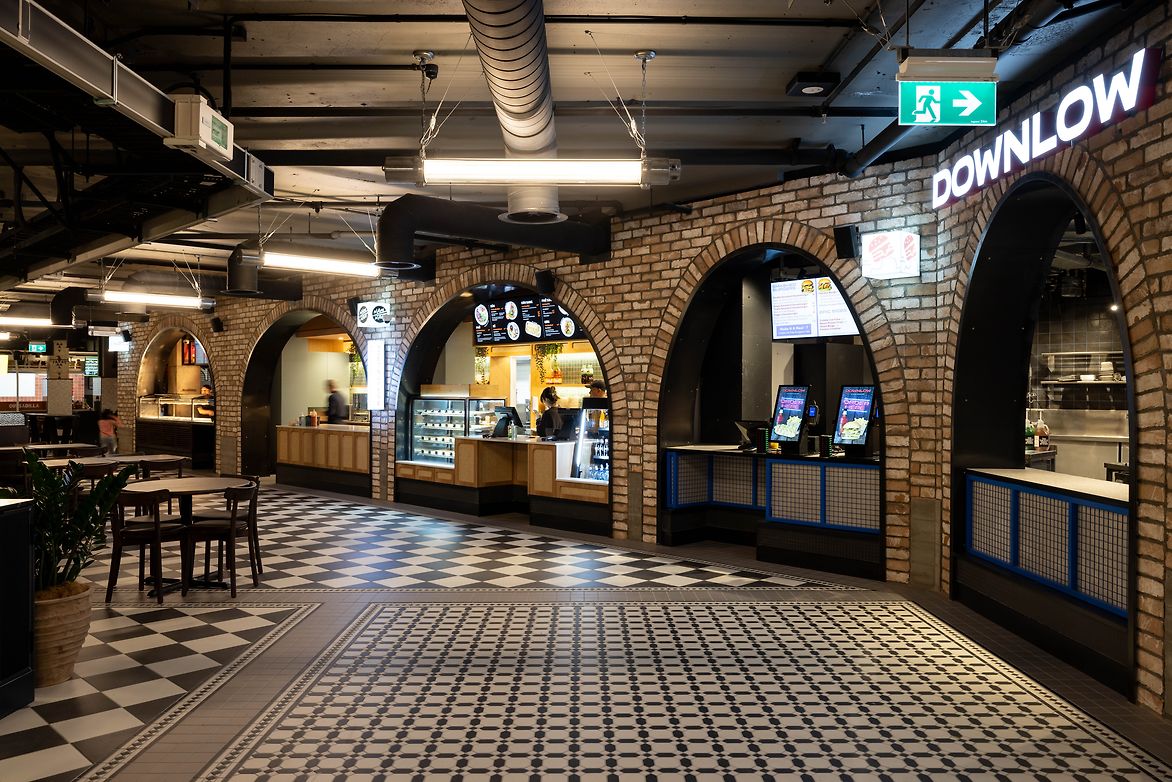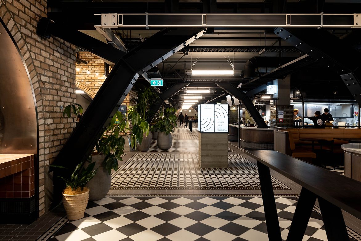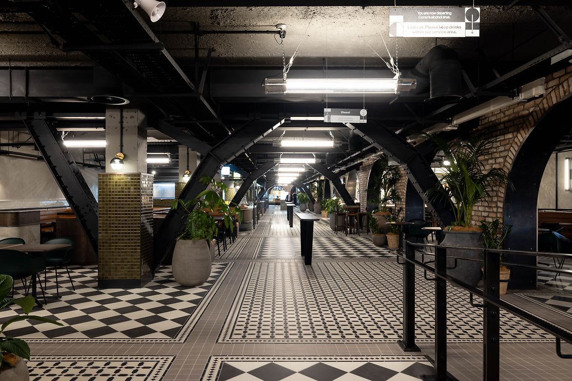 Archways divide the space into intimate sections, fostering a sense of exploration and discovery. Splashes of colour and intricate details in tiling, upholstery, graphics, staging, and greenery add a human touch to the underground environment, complementing the diverse culinary offerings from the array of vendors.
