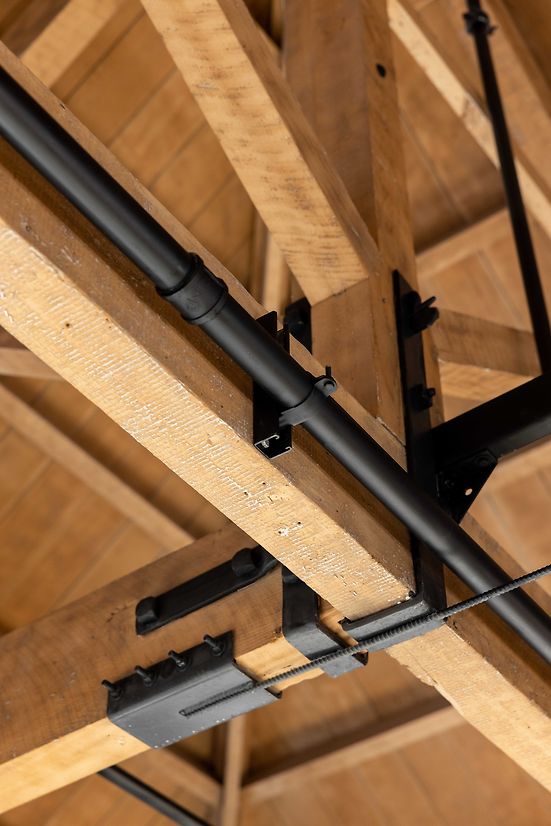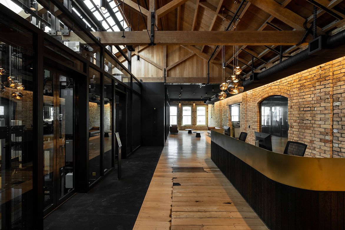 A key challenge was combining the buildings into a single address offering sufficiently large floor plates for modern offices, while celebrating their layers of history. The solution involved removing a single bay within the existing timber post and beam structure, allowing the insertion of a new core incorporating glass lifts, a stairway and linking steel that binds the buildings into a stable whole. This resolved accessibility issues across differing floor levels, delivering a clear diagram where heritage and new are blended but apparent. New materials are steel and glass, sympathetic to the existing heritage technologies.