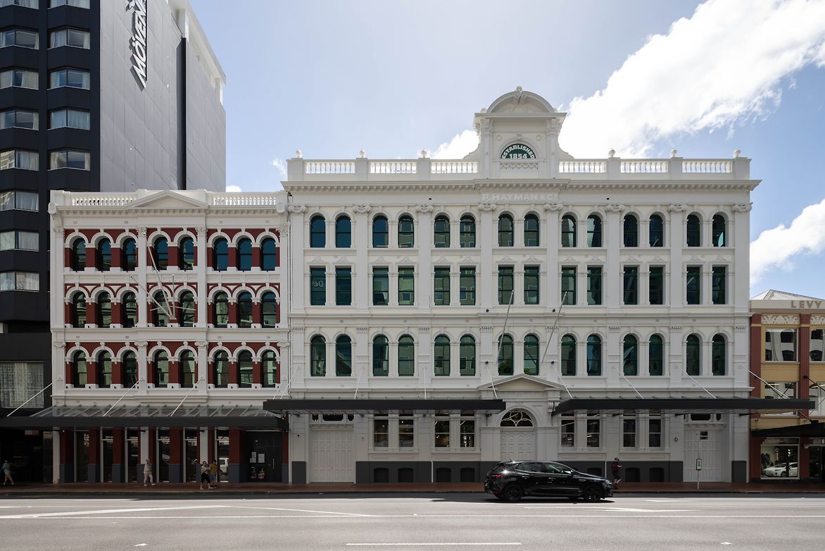 Heritage facades are preserved with openings limited to extensions of existing fabric for retail frontage. Two new sets of round windows face towards Takutai Square, Britomart’s ‘heart’, their diameters matching the arched heritage windows adjacent. Plant rooms enclosed with round section screens emulate heritage rooftop reinstated balustrades. The Customs Street façade features a replica heritage pediment, replacing the original destroyed in earlier earthquake proofing. Research determined this element’s geometry, followed by digital modelling, mould making and fabrication in GRC.