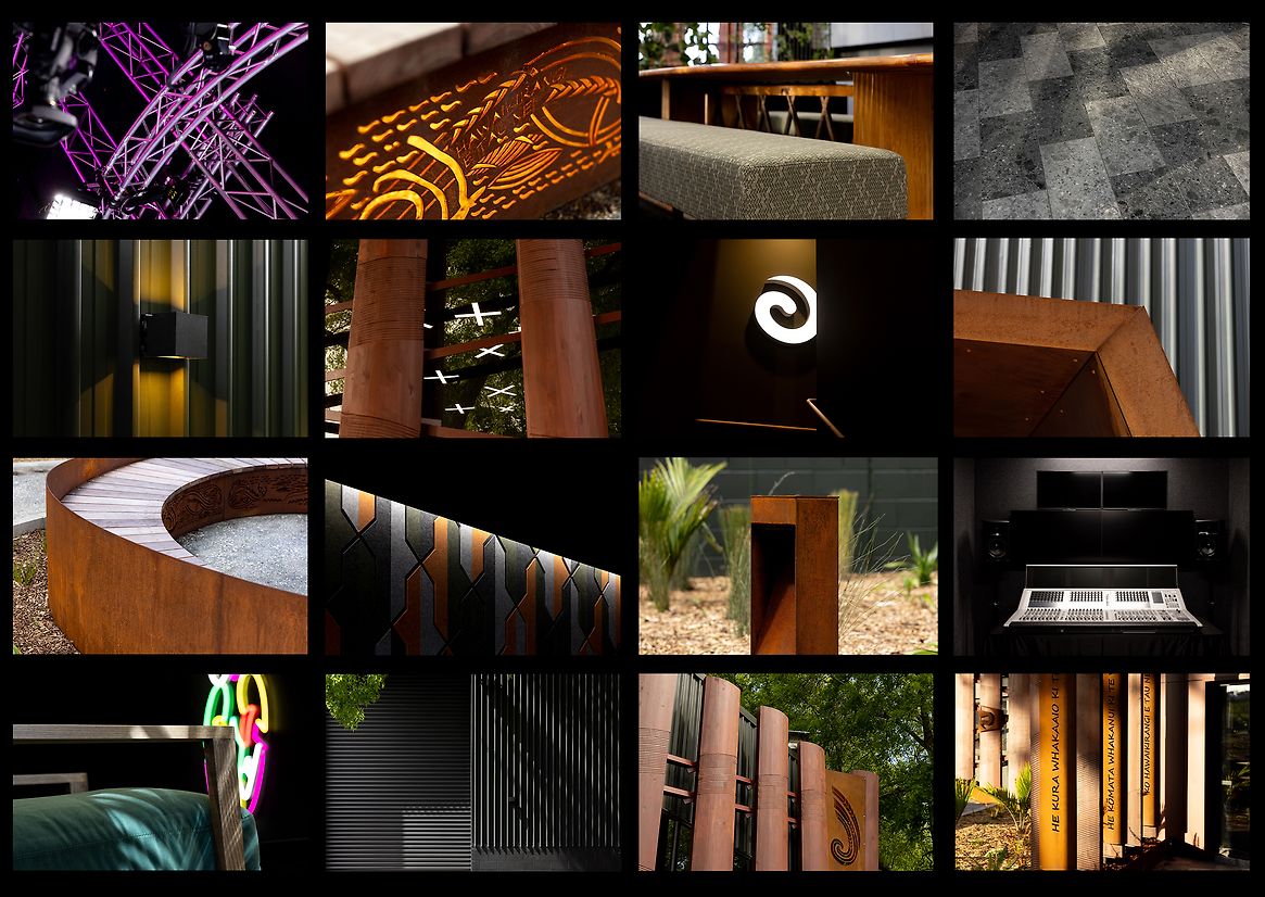 We wrapped sculpted pou around the building which supports filtering light and aids privacy into the creative workspaces. However, the Pou are intended as Kaitiaki which protect the creative work that happens within. The custom steel brackets also introduce strong visual cues to moko kauae and identity. In the studios, functional acoustic membranes are imbedded with decorative purapura whetu patterns which were designed for the main Whare, and create further connection.