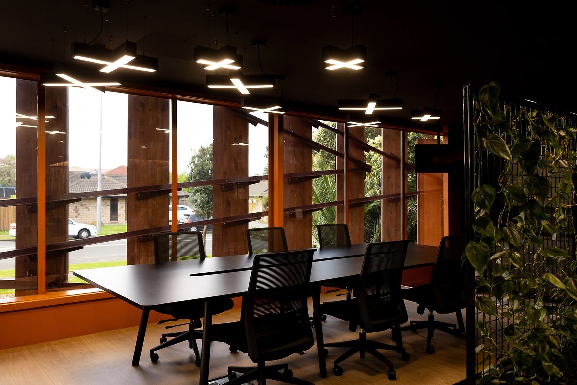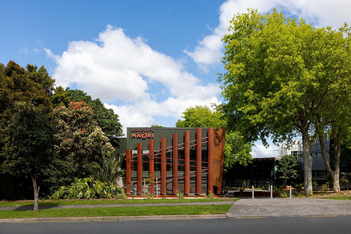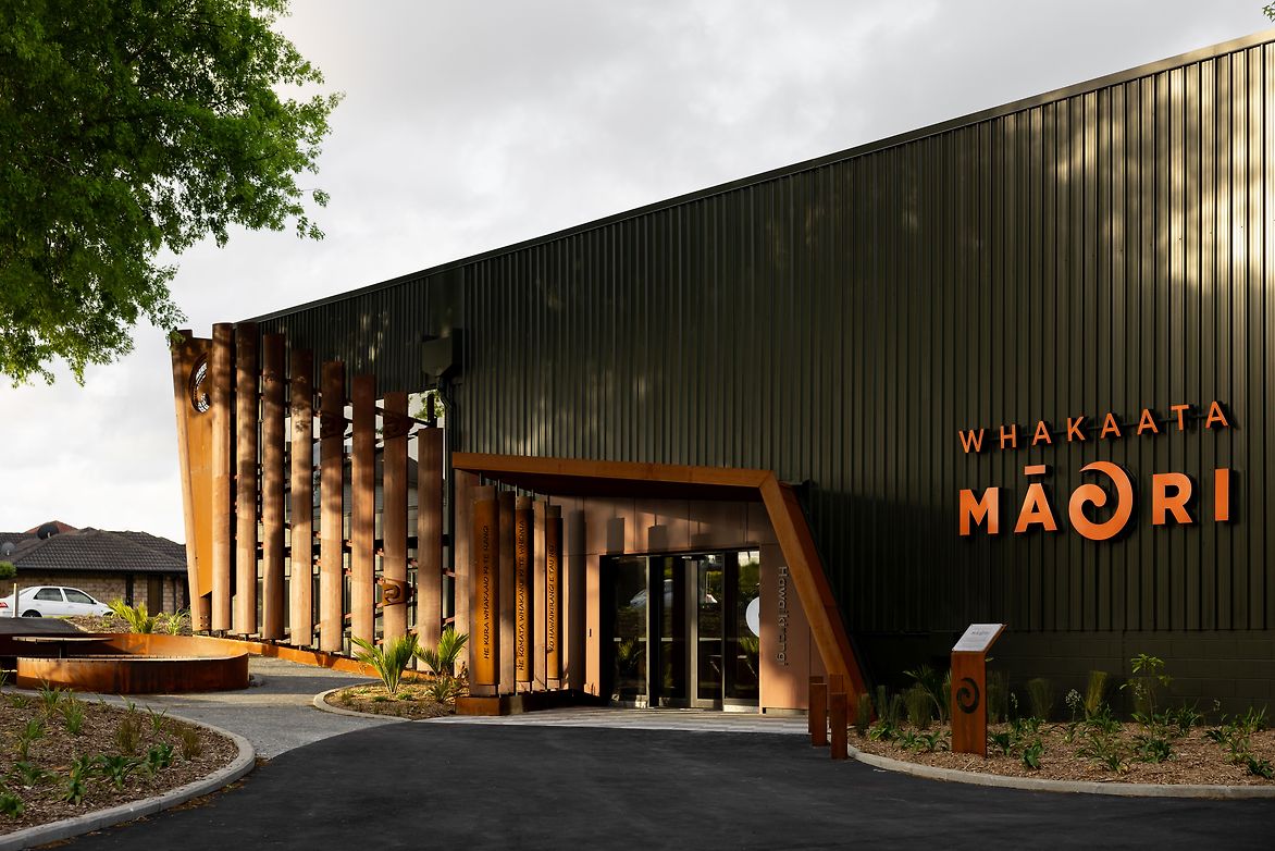 Our material and colour palette was largely influenced by the process of producing kokowai pigmentss. Earth tones, burnt tones, olive tones. It was appropriate that a Māori creative medium could inform a Māori creative environment. We overlaid darker olive tones across the building shell so it sat gently with the leafy environment. This then allowed us to introduce cor-ten steel and timbers to dress the exterior. Additional steelwork, tiling, acoustic paneling, carpet and paint - are all derivative from the kokowai palette. All detailing is custom and derivative of the Hawaikirangi narratives - the board tables, the seating, the pou, the brackets, the acoustic material.