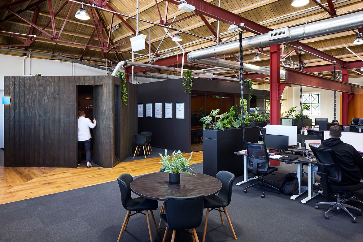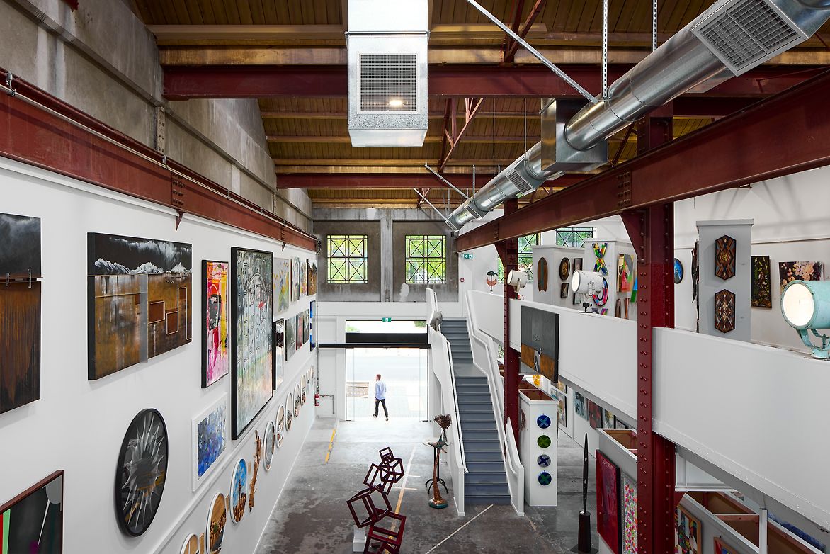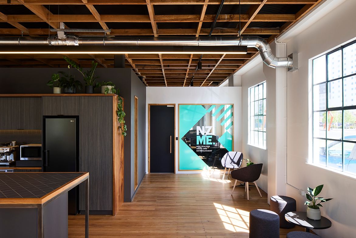 The art gallery is in a former workshop with double height space, allowing the public to get a feel for the buildings scale and volume, and the tenant to display large pieces. To ensure the rest of the building felt active, planning located all the office’s shared spaces to the North. Staff cafes and breakout spaces keep the lights on and the building alive at night. A loading bay roller door was replaced with a 4m high window, allowing the public to see into the live studios of NZME, the ground floor tenant.