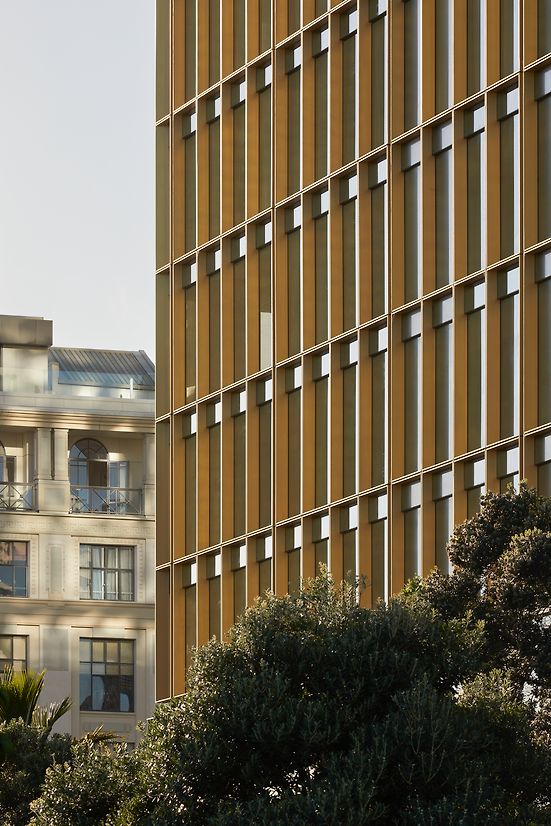 Te Kaha Deloitte Centre had high aspirations to be a sustainability exemplar, targeting a 6 Star Green Star and 4 Star NABERSNZ ratings. The InterContinental's distinctive golden fins and high-performance glazing enhance energy efficiency while distinguishing the hotel within the development.