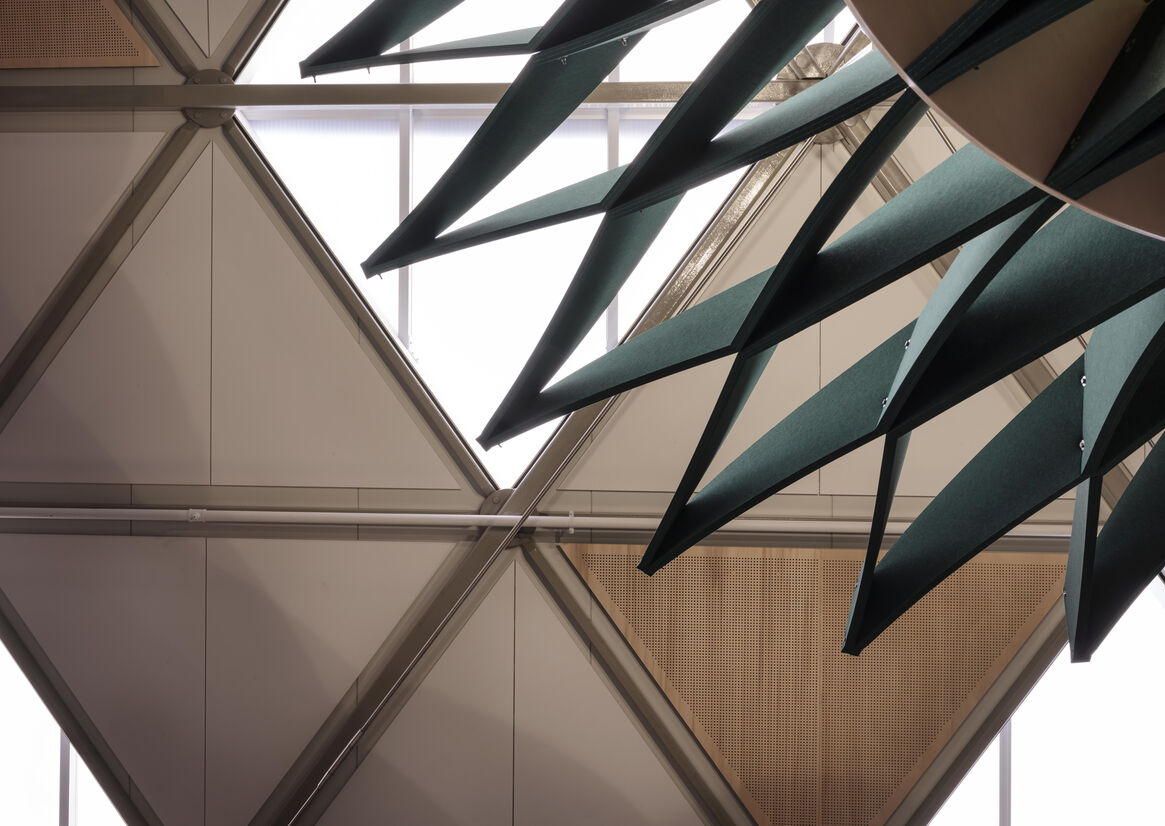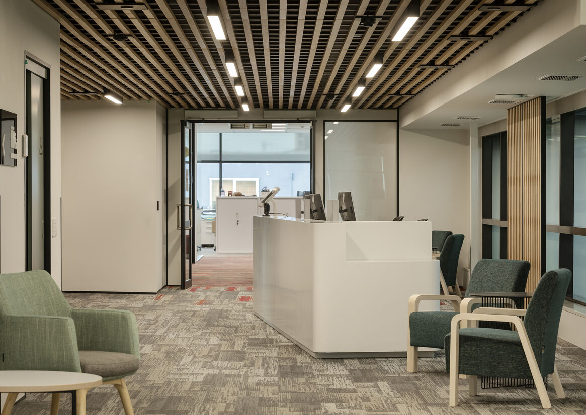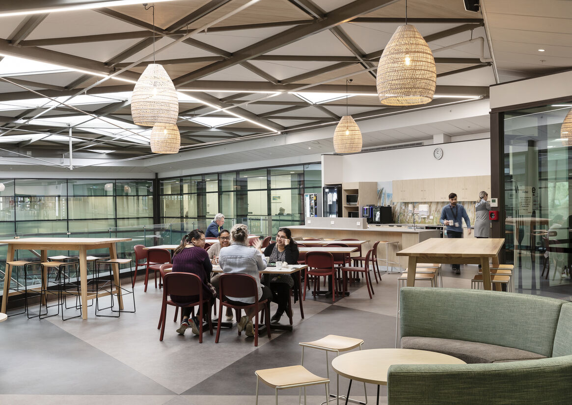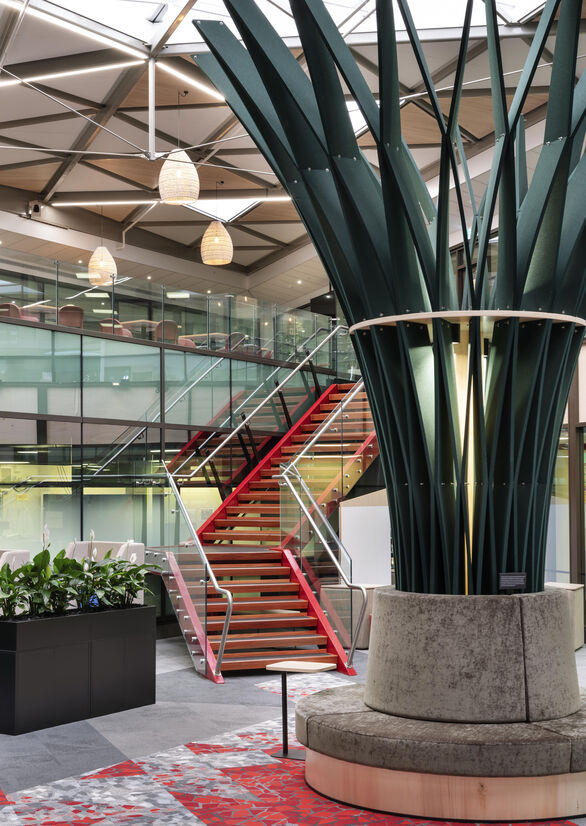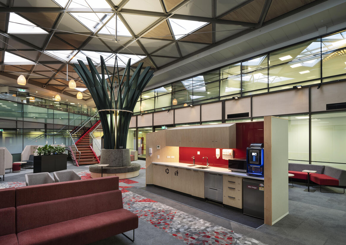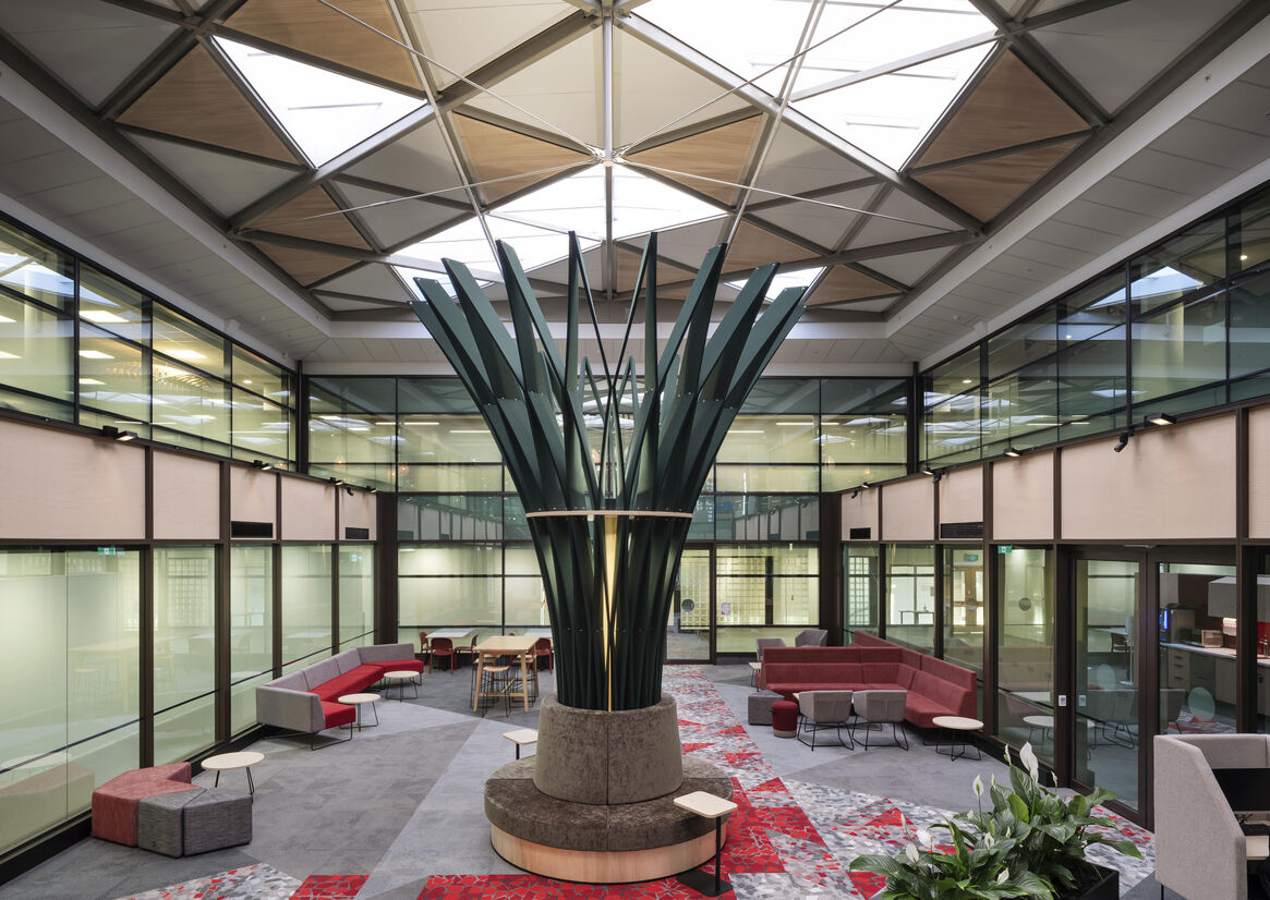 The refurbishment presented an opportunity to convert the buildings existing, virtually un-used, outdoor courtyard into a usable covered atrium space. Now, with works complete, the atrium is now the heart of the building with the architecturally designed tree in the centre a unifying feature, both visually and functionally. The conceptual name for the tree is called the ‘weave tree’, relating to the ‘leaf’ shapes in the ceiling structure. The tree has biophilic origins, an extension of nature that fosters happiness and wellbeing, providing acoustic, lighting, and visual separation within the space.