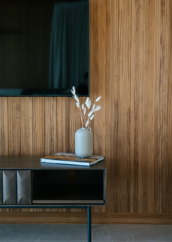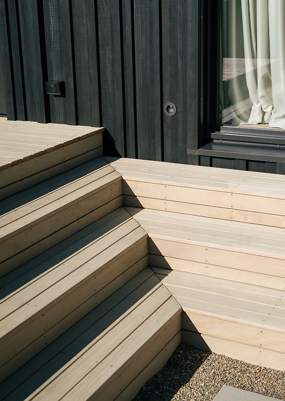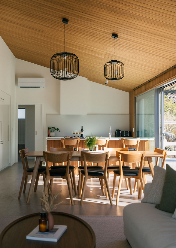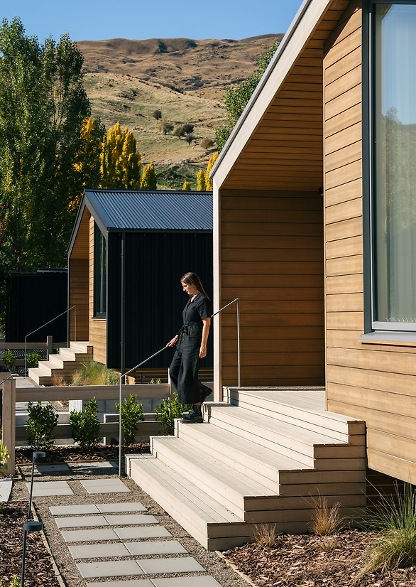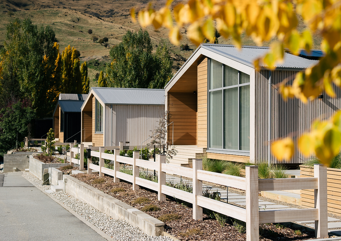 The form and design language of each villa follows the topography of the landscape, while the varied shades of timber cladding lend itself to the golden tussock surrounding the village. Each villa presents a distinctive palette inside and out, with exterior claddings, decking, post and rail fencing, timber interior feature walls, ceiling linings and kitchen joinery, showcasing a combination of sixteen timber profiles in six different finishes.